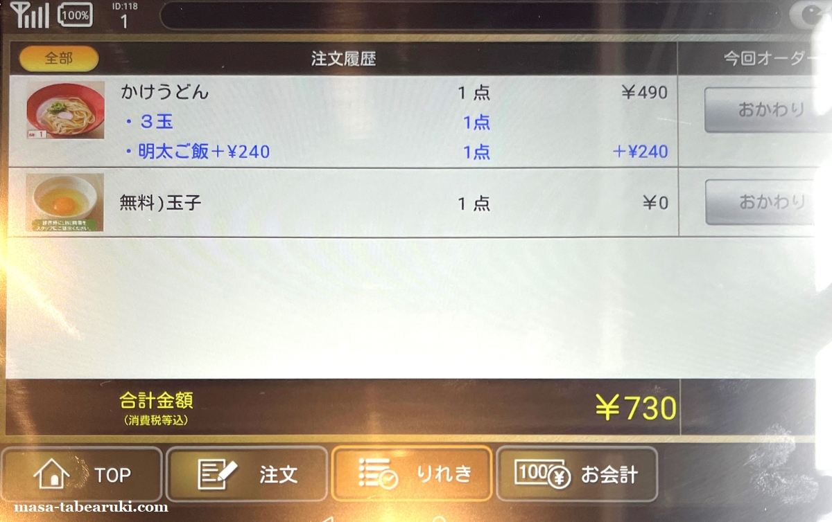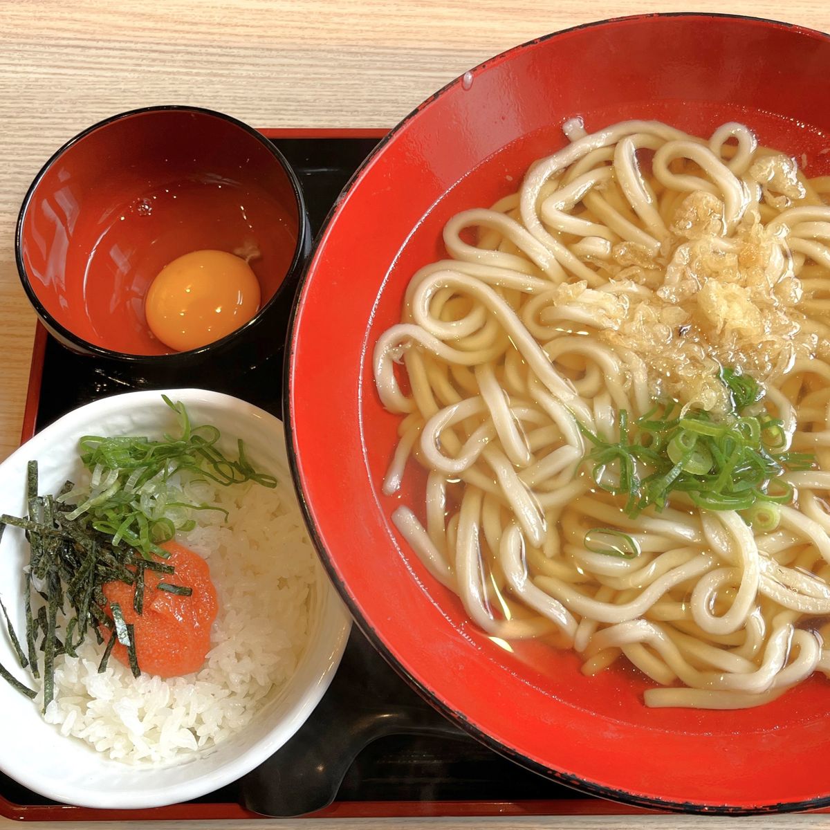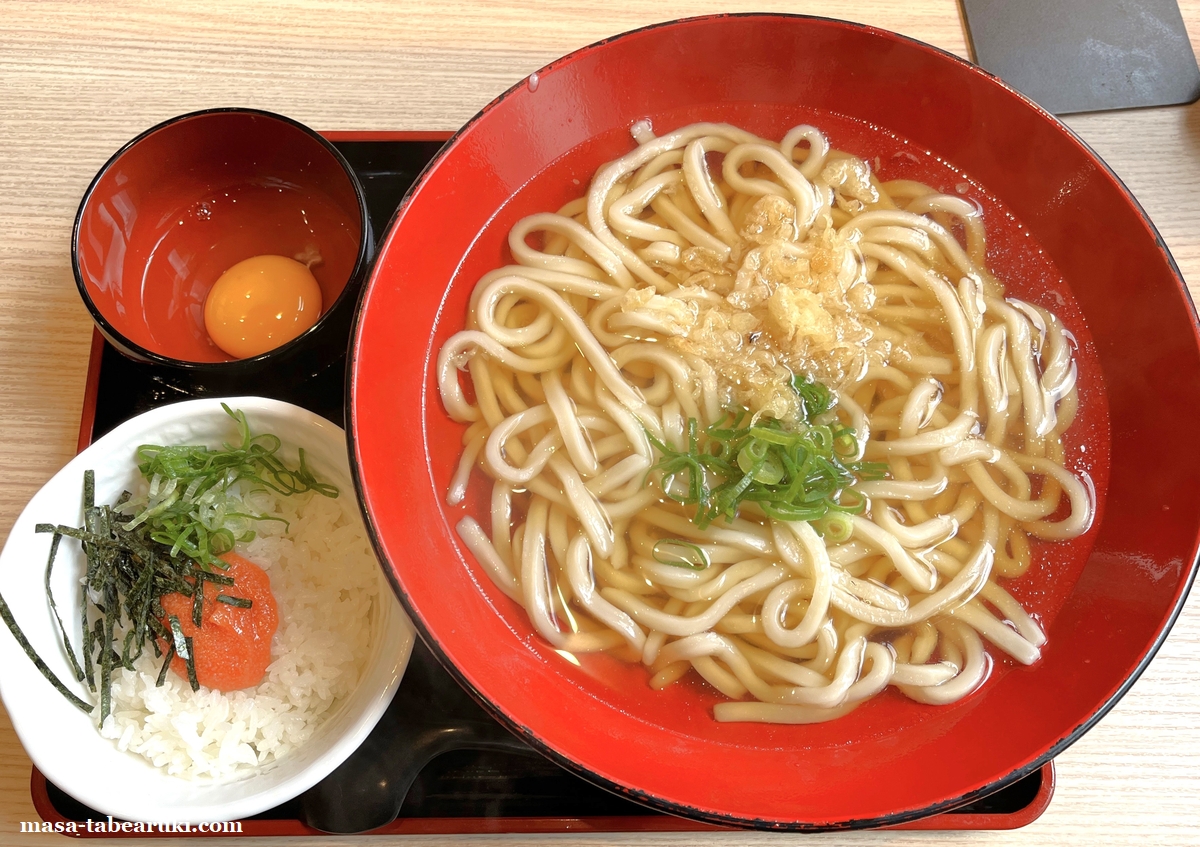 かけうどん(490円税込)+明太ご飯(240円税込)+玉子(0円)で合計730円(税込)となかなかリーズナブルに食べることができ、早速頂きます。