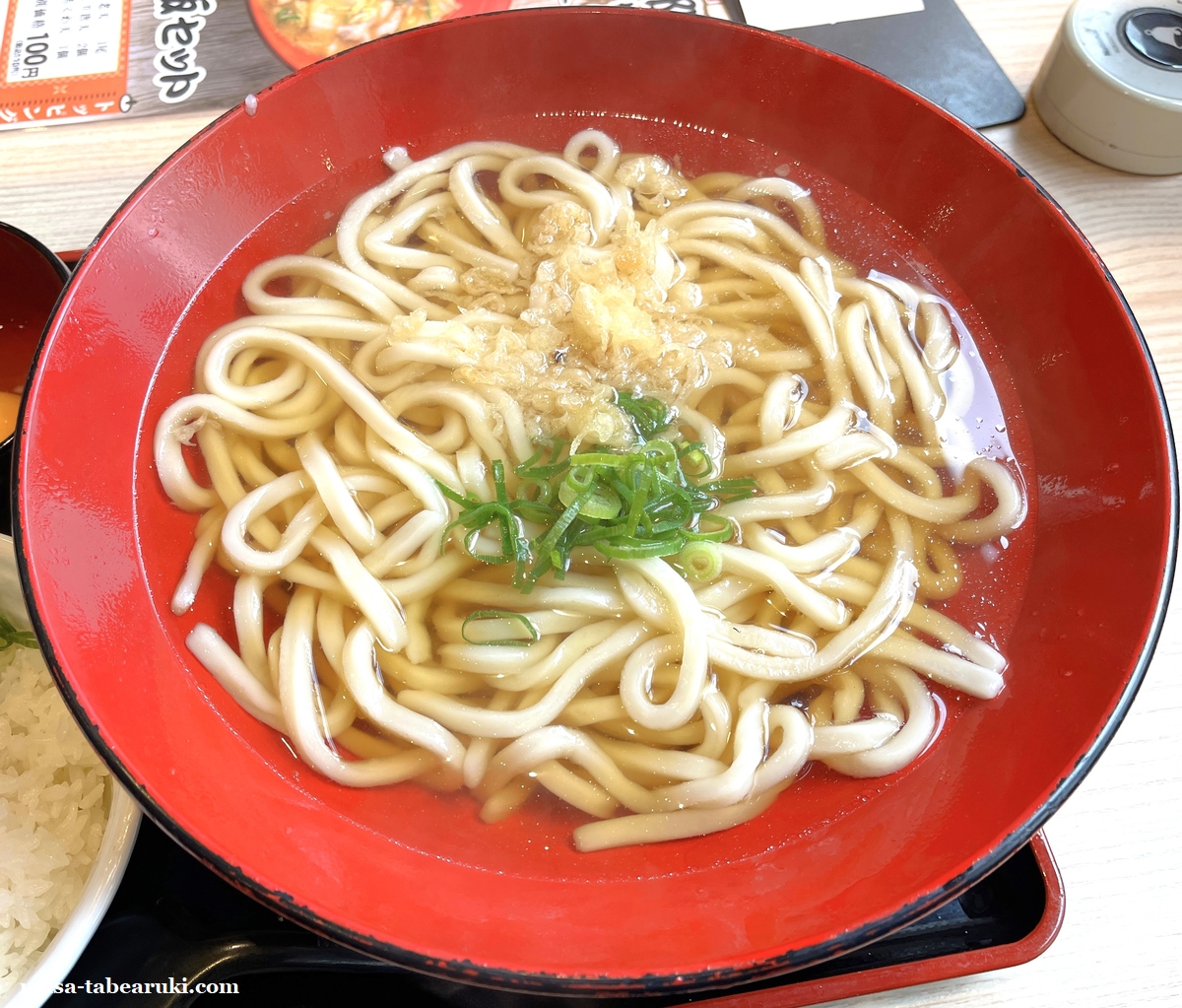 かけうどんなんで具材はネギと天かすのみと非常にシンプル。うどんはその時々で茹で加減が結構変わるんですよね。以前に食べた時は箸で持ち上げただけでプツプツとうどんが切れてしまったりして。。今回はちょい柔らかめながら問題はありません。