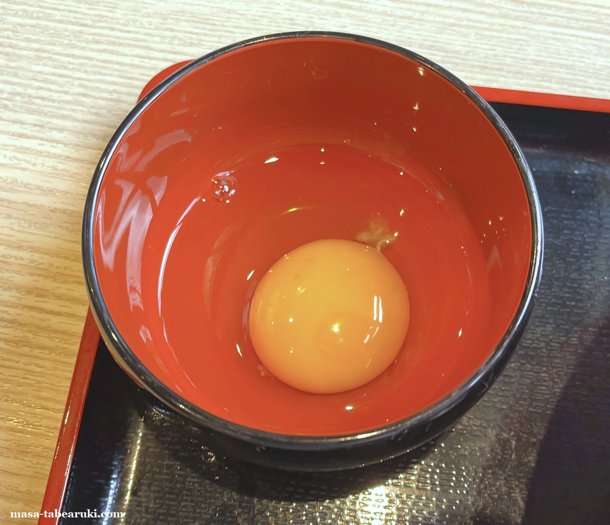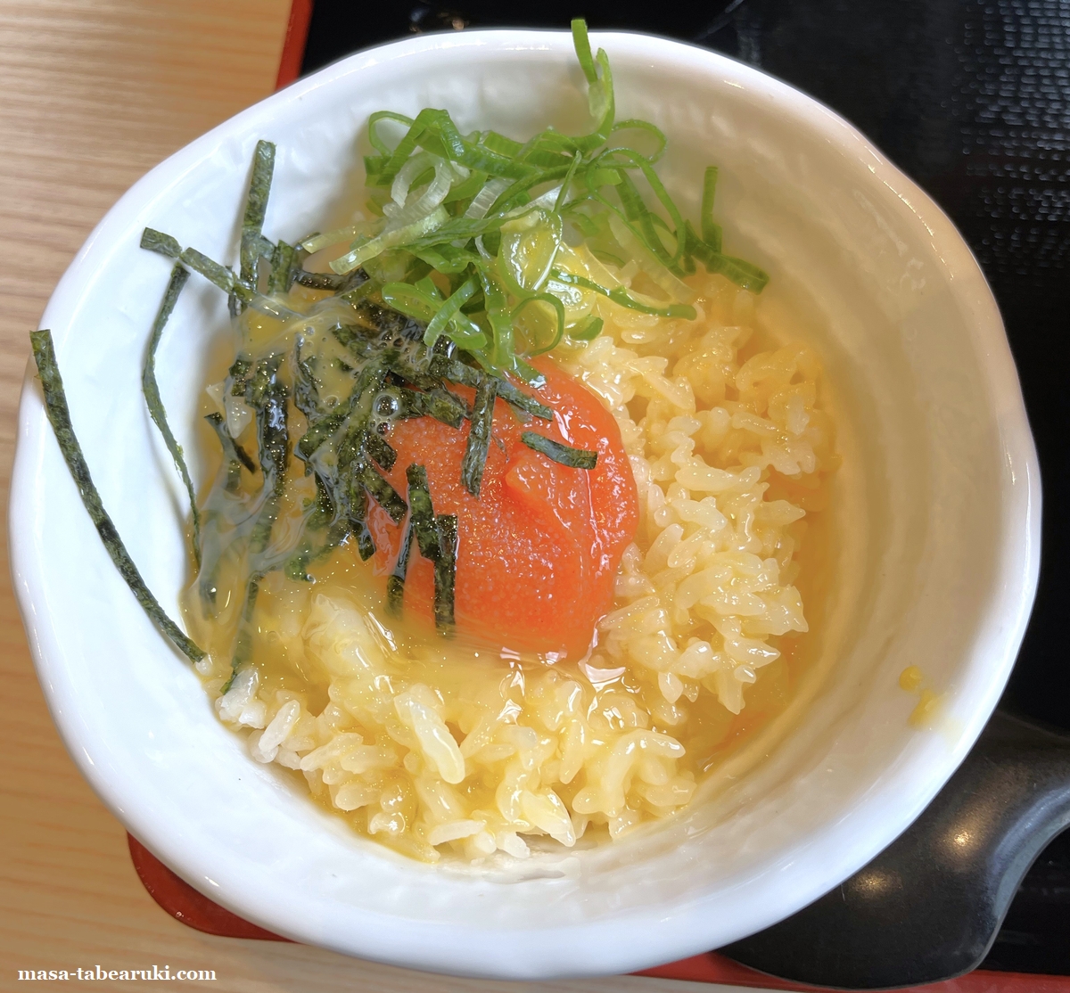 無料でもらった玉子はうどんに入れても良いけど、私は明太ご飯にかけて卵かけご飯にするのが定番。卓上に醤油は無いのですが、明太子の塩気で十分に旨い。これも満足感を得るひとつの要素になっている気がしますね。