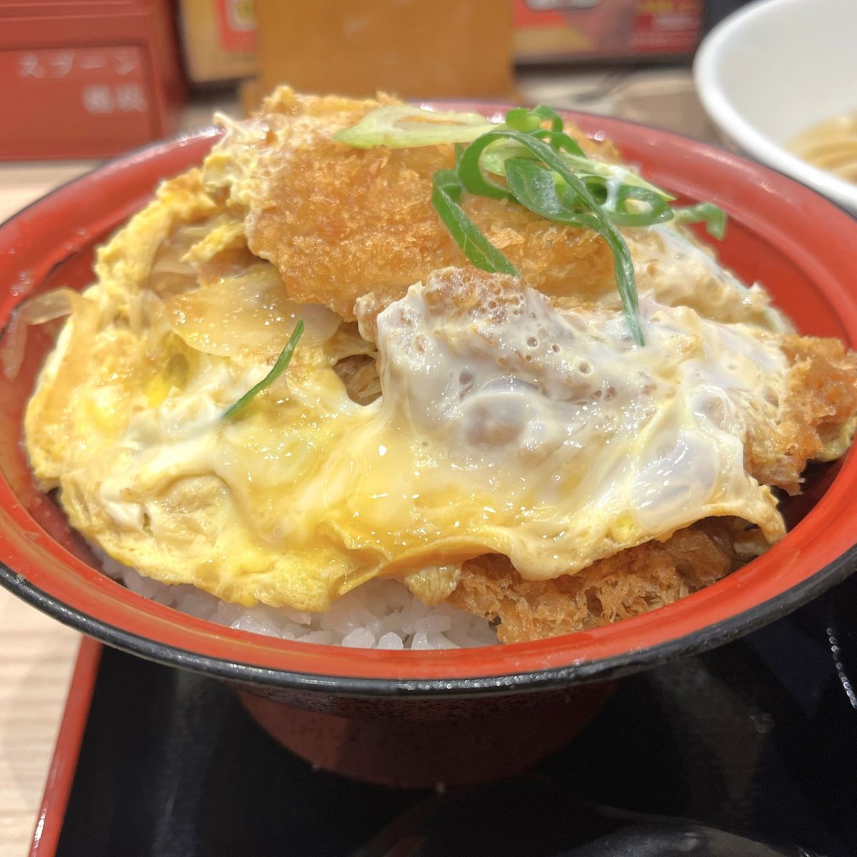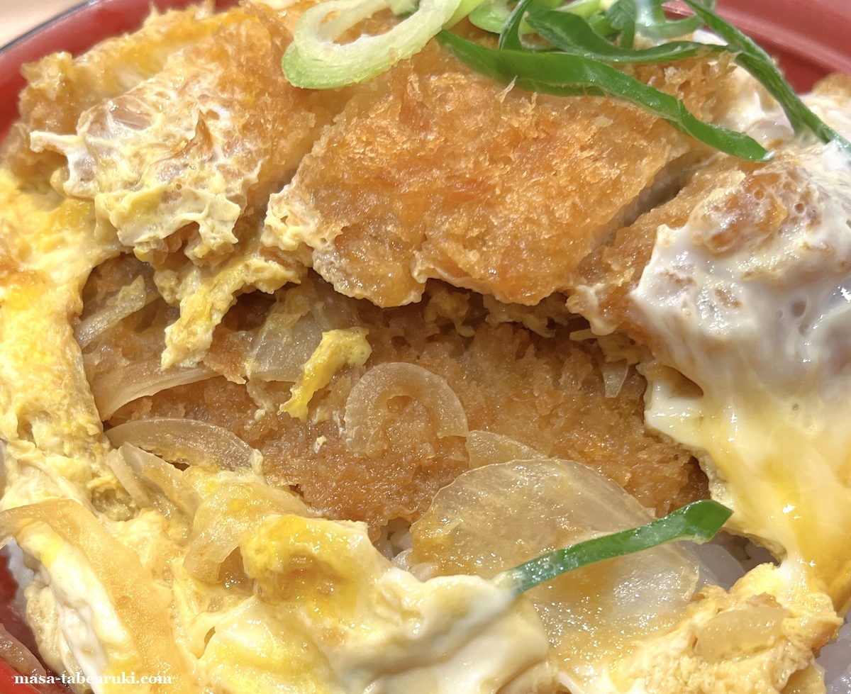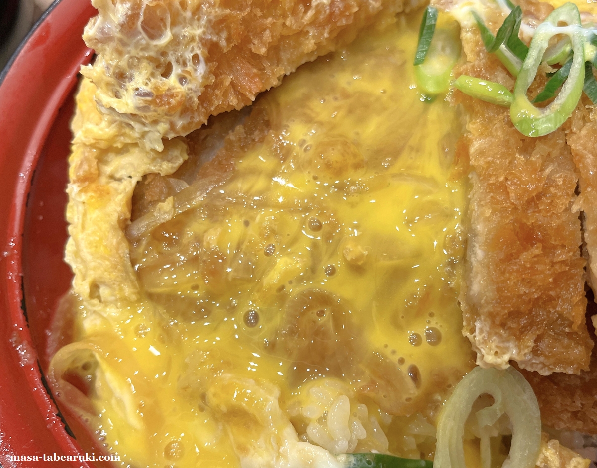 上のカツを移動させてみると、ちゃんと下にも同じカツが載っております。ほどよい厚みのある豚肉の食感は柔らかで、コロモもサクッとした食感。玉子も良い具合に半熟になっていますが、カツ2枚に対して玉子の量はちょっと少なめに感じるのが唯一欠点でしょうか。