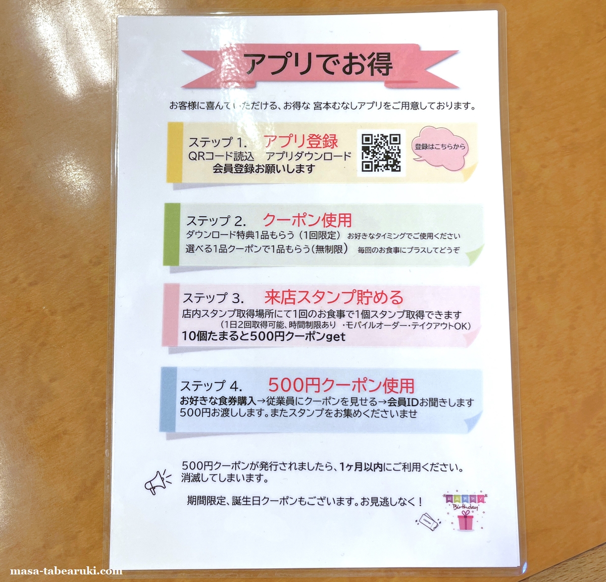 アプリの方にはクーポンの使い方として券売機でQRコードを読み取らせるように書かれていましたが、このポップにはこのように書かれています。