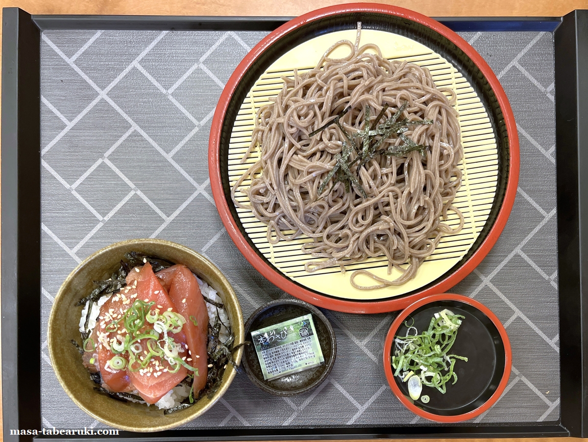 あるメニューとはまぐろ丼とざるそばがセットになったもので、丼の大きさがそれほど大きくはなかったため、恐らく「漬けマグロ丼(小)とざるそばセット」なのかと思われます。