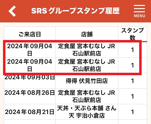 急いではいたのですがちょっと気になったのは1日に複数回SRSホールディングス系列のお店に行った場合、スタンプはどうなるんやろ?ということ。取り敢えず、お店にあるQRを読み込んでみると問題なくスタンプは加算されており、履歴も同じ日に2回来ている形になっています。