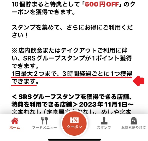 今回はSRSグループでの食事を1日に複数回した場合、スタンプはどうなるんやろ?と気になったため、朝に続いて昼も来店してみました。結果、スタンプは1日に2つまで貰えることが分かり、2つ目を貰うときは3時間以上空けることが必要とのこと。