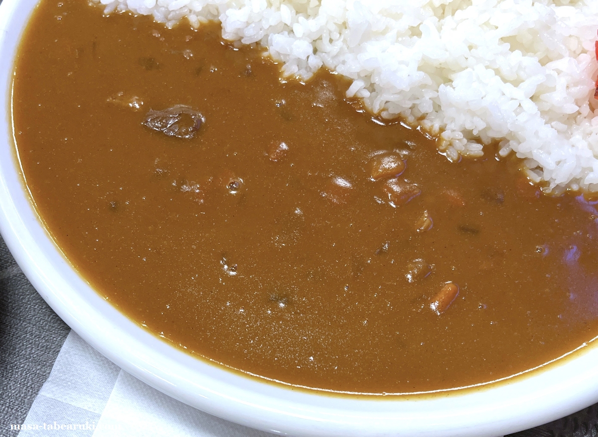 まずカレーの辛味に関しては個人的な受け方はありますが、私にはぼぼ辛味は感じないくらい。牛肉や人参等の食感はありながらもかなり細かくなっており、食感も柔らかい状態。レトルトカレーと同じ様な雰囲気で特別な(特長的な)感じでは無かったのが惜しいところ。美味しく無い訳ではないんですけどね。。