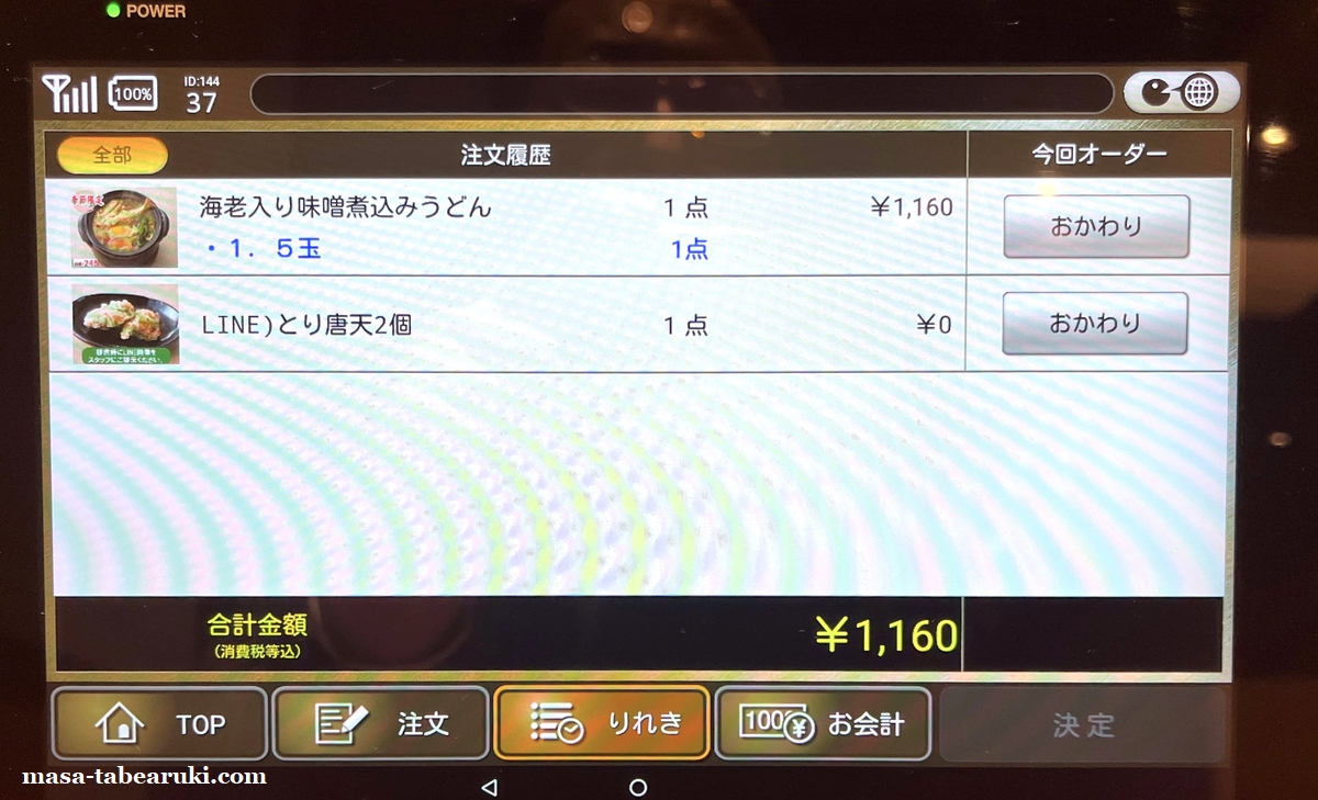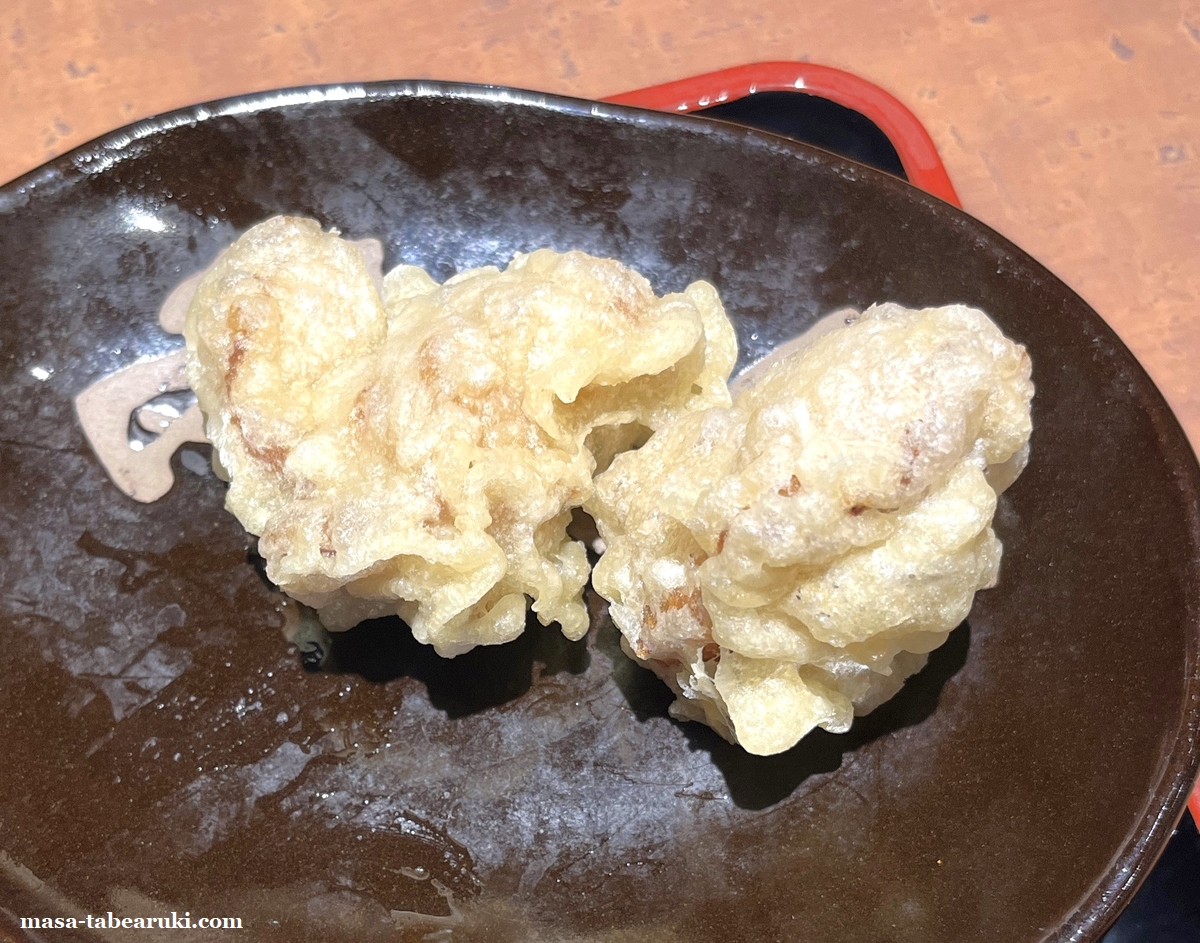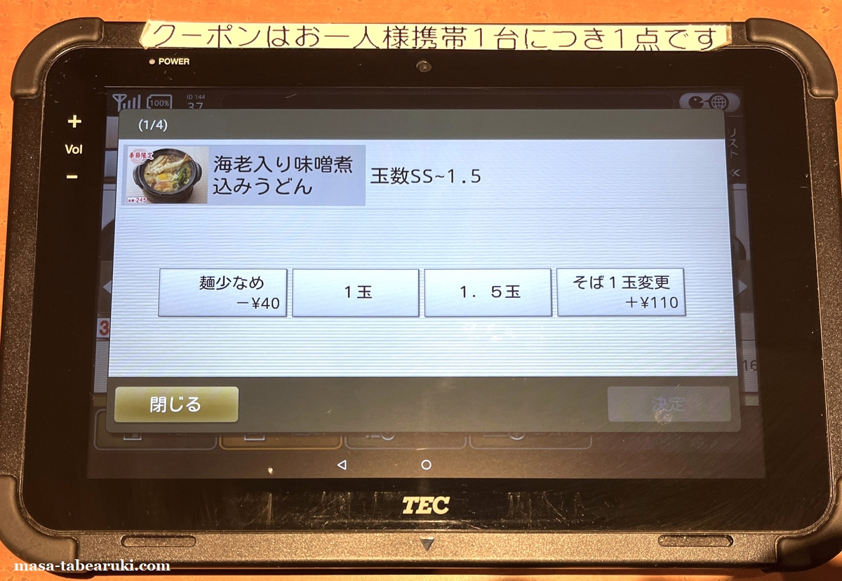 価格はどれも同じで鍋焼きも良いケド今回はより温まりそうな「海老入り味噌煮込みうどん」を選択。うどんは1.5玉まで無料で増量出来るのでもちろんお願い。そしてLINEのクーポンで鶏天2個がサービスになるものがあったのでこれも注文しました。