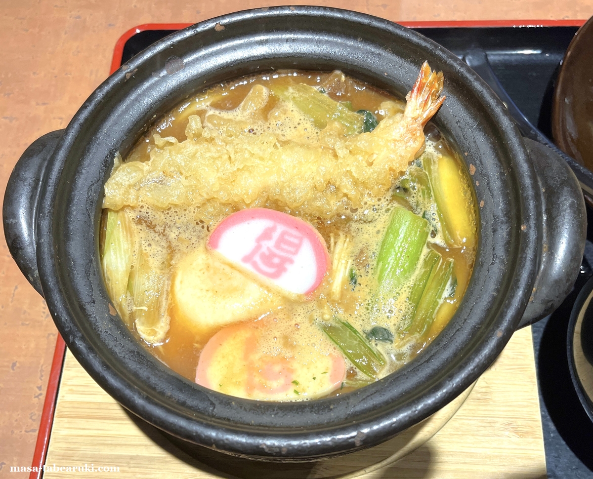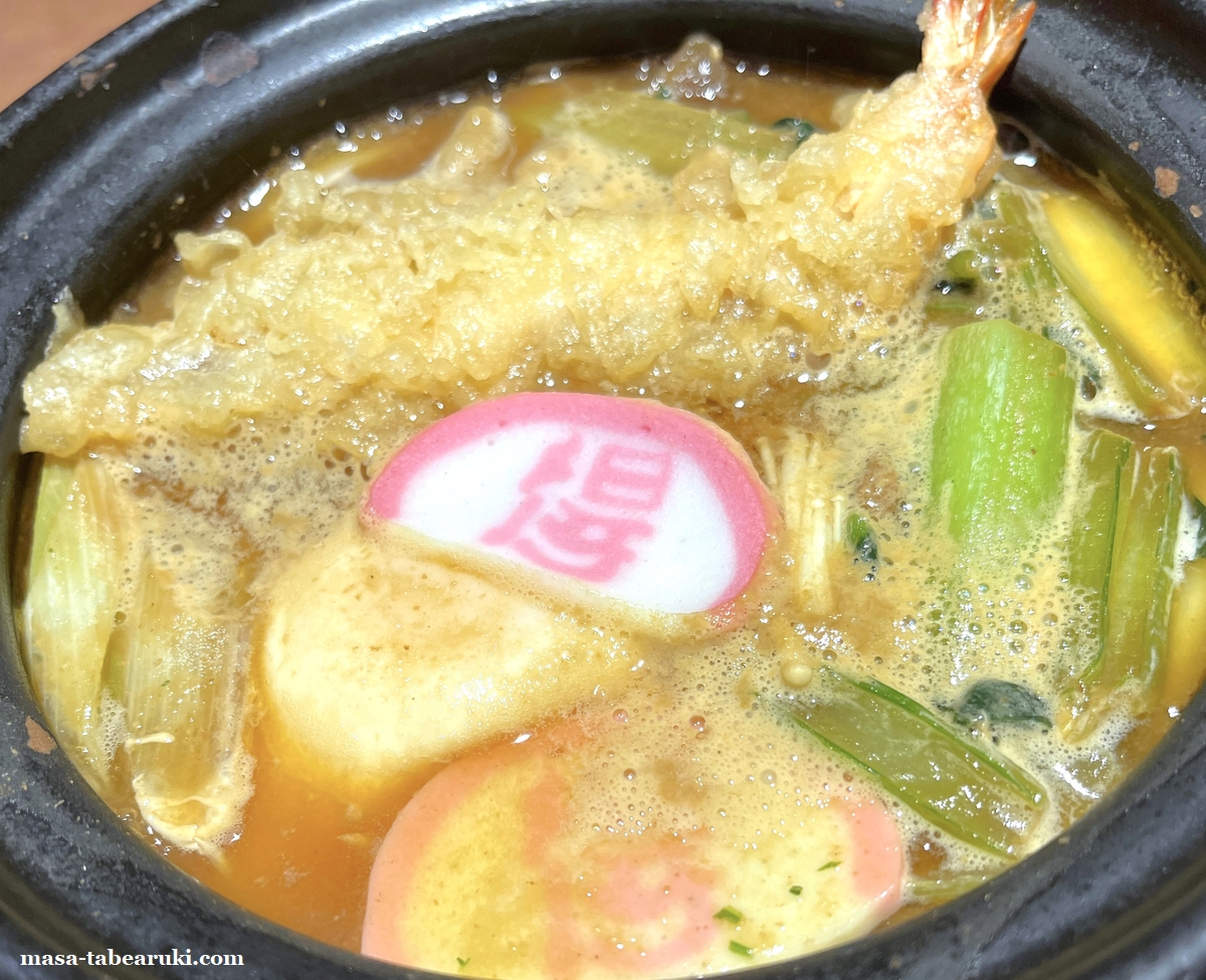 今回はなかなか肌寒い気候になってきたので、熱々になりそうな「海老入り味噌煮込みうどん」を食べてみました。具材も多くなかなか満足感の高い一杯で、グツグツを煮立った味噌スープがさらに熱々感を演出。