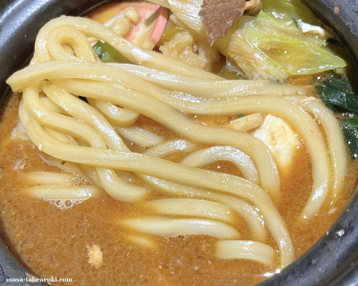具材はかなり多く、ザッと確認しただけでもネギ、小松菜、えのき、海老、玉子、牛肉、カマボコ、里芋、コンニャク、椎茸、人参、牛蒡、大根と豚汁などで使われる様な具材も入っており、なかなか色々楽しめます。うどんは太いですが、かなり温まっているため柔らかい食感。1.5玉では少ないかな?とも思いましたが、色んな具材があるためなかなか満足感もありますね。
