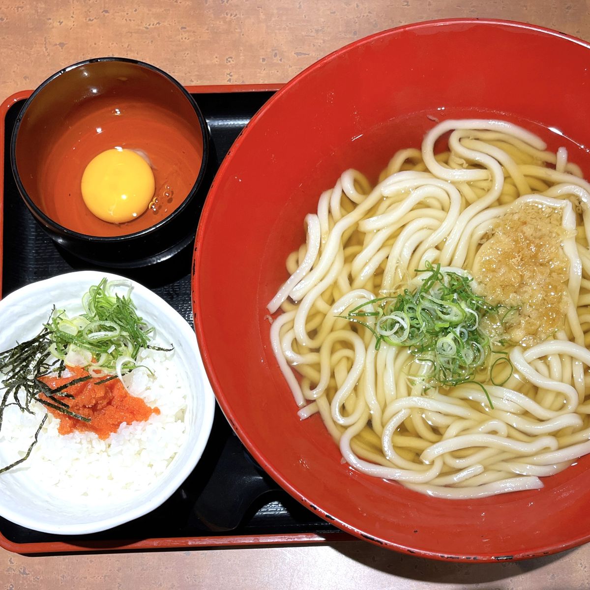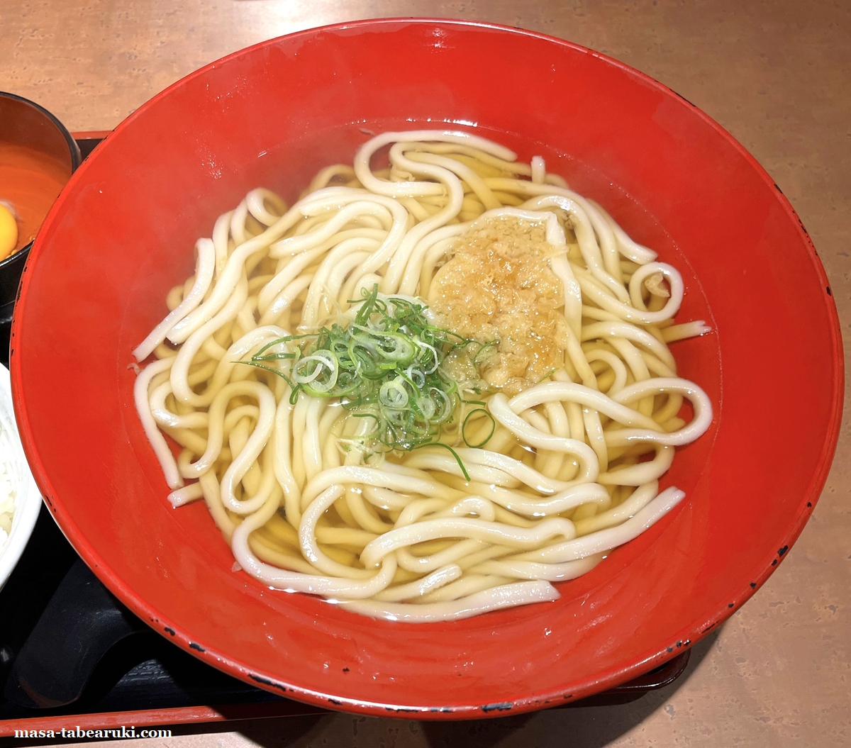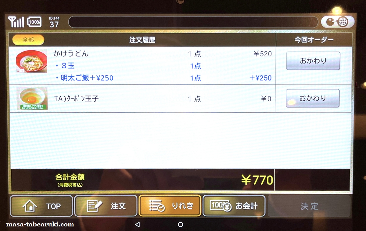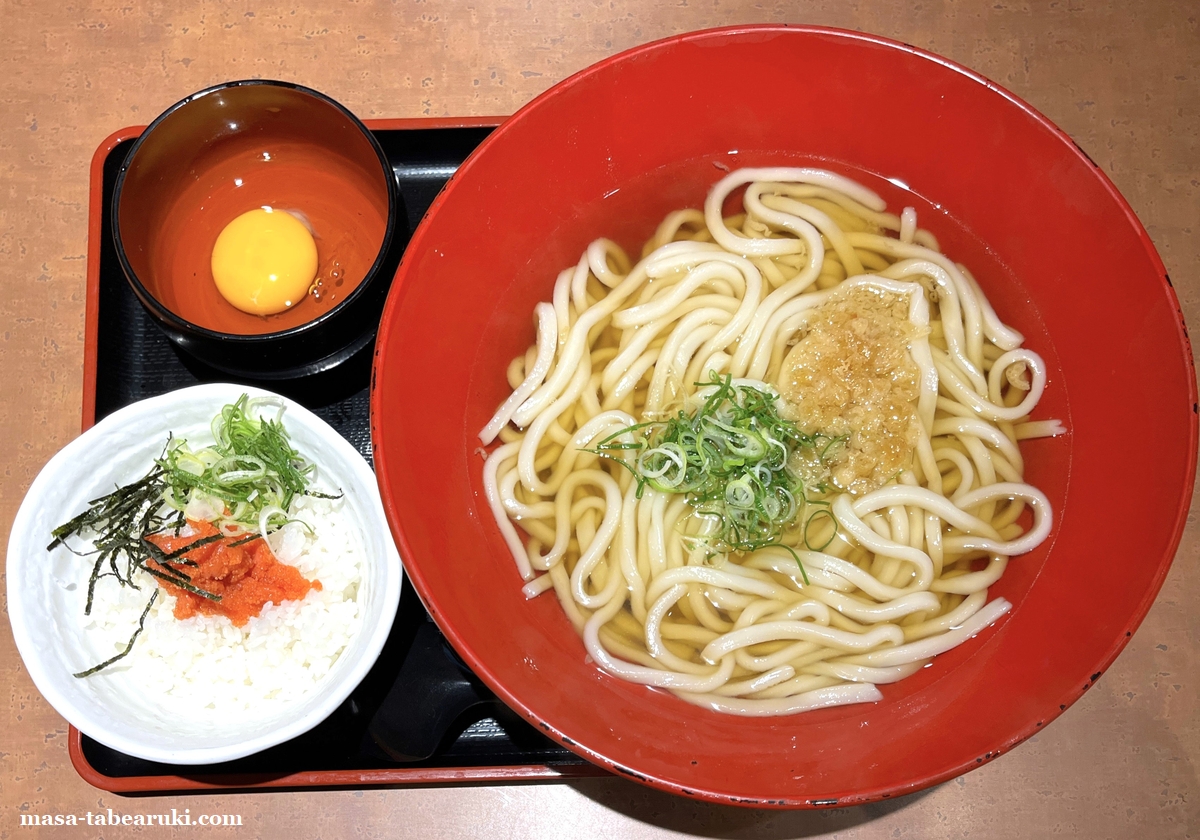 では、最後にいつもの私のお気に入りの食べ方、かけうどん(3玉)+明太ご飯+LINE無料クーポン(生たまご)の組み合わせで食べました。価格はかけうどん(3玉)520円(税込)+明太ご飯(セットでは250円(税込))+LINEクーポン生たまご(無料)で合計770円(税込)。この組み合わせが自分には安く食べられ満足感も得られるんよね。