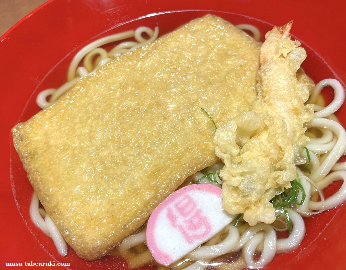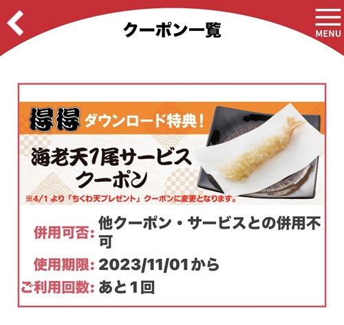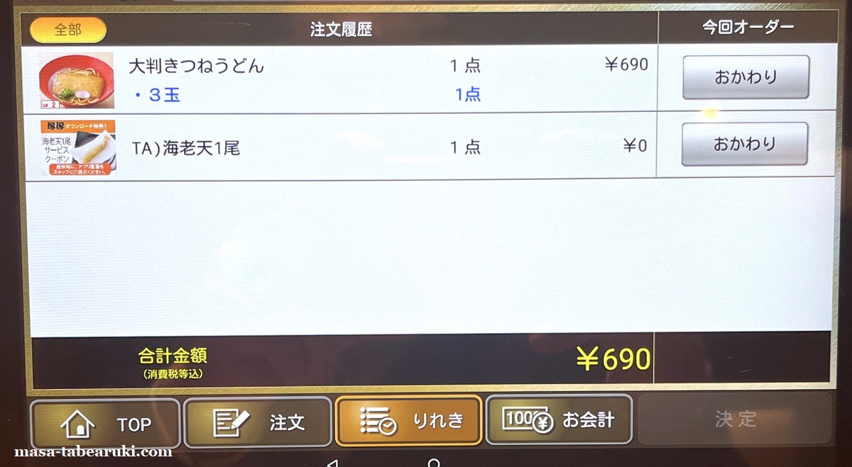 初めてアプリをダウンロードした特典として貰った「海老天1尾サービス」クーポンで、1年半くらい放置してました。これとうどんは今回単品にしようと思い「大判きつねうどん」を3玉で注文。ただ、最近は割と確認されていたのに、今回はクーポンの使用確認に店員さんが来られなかったので使用済にしておきました(笑)
