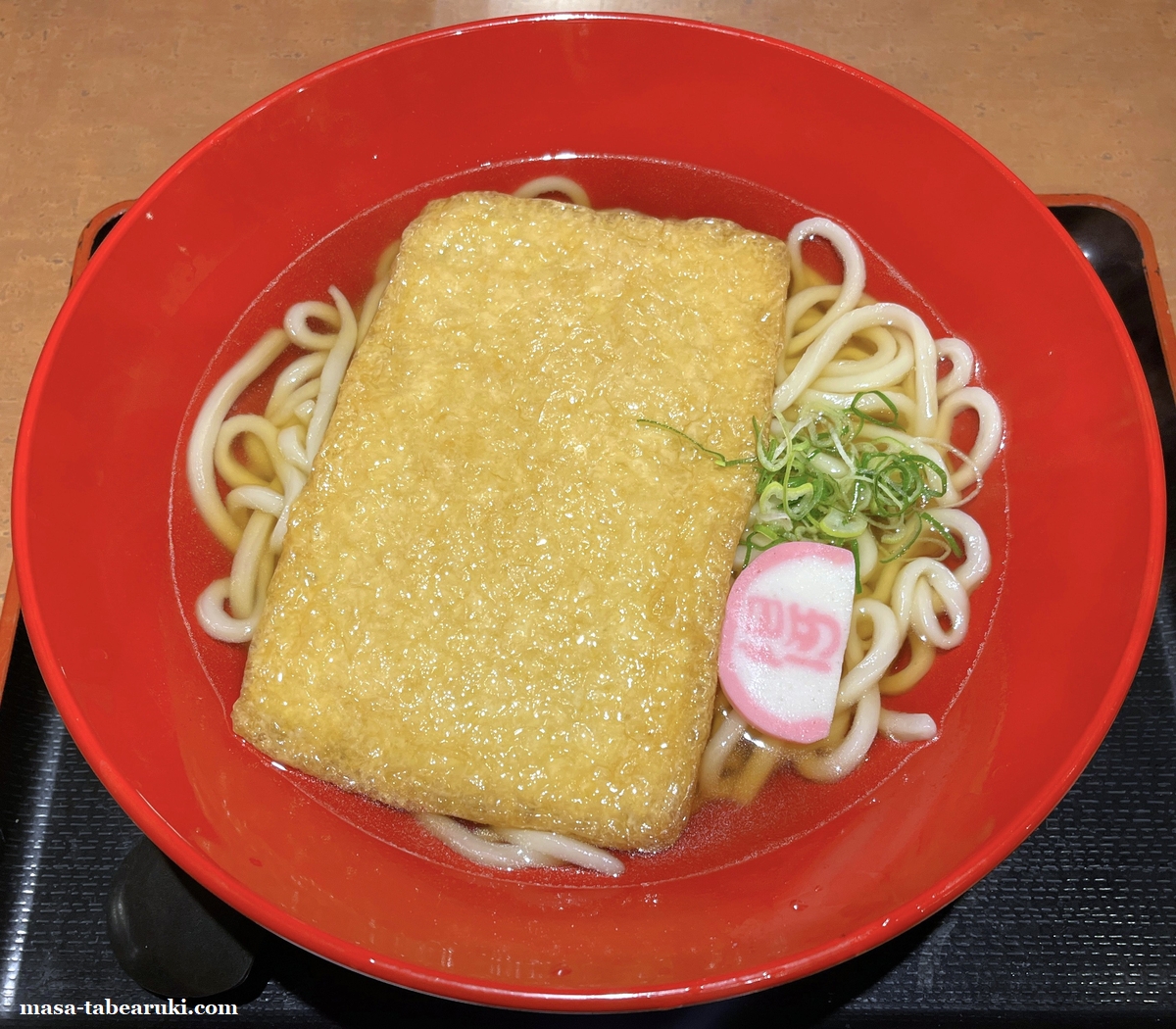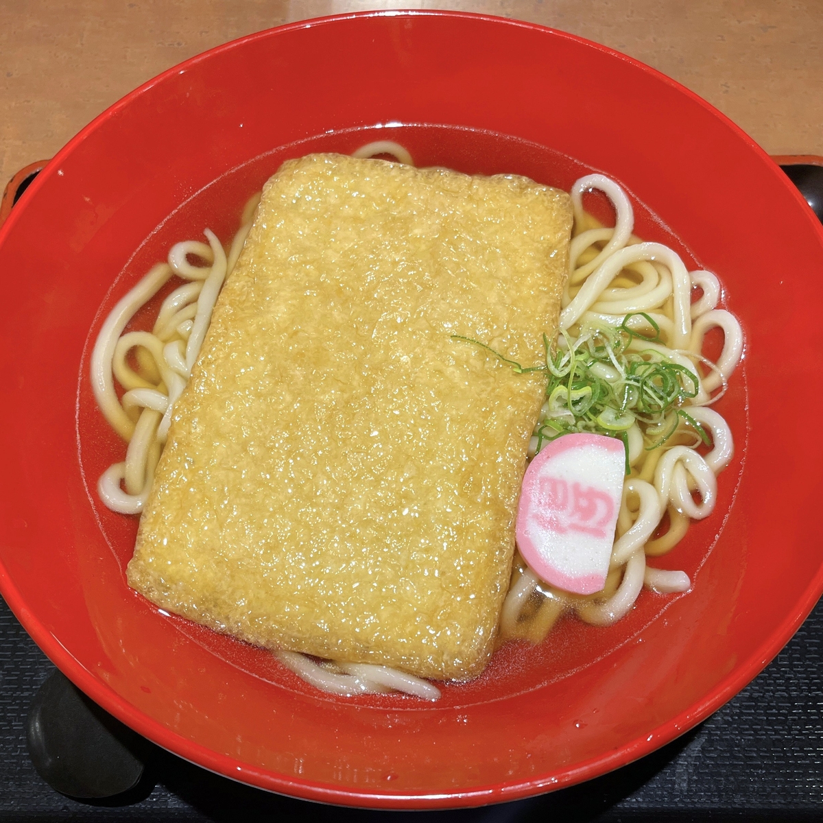 ”大判”というだけあり、きつねのサイズはデカいです。この赤い丼も直径30㎝くらいはありそうなんですが、そんな丼の中に収まりながらも存在感はかなりあります。他の具材は得の字かまぼことネギといったところ。