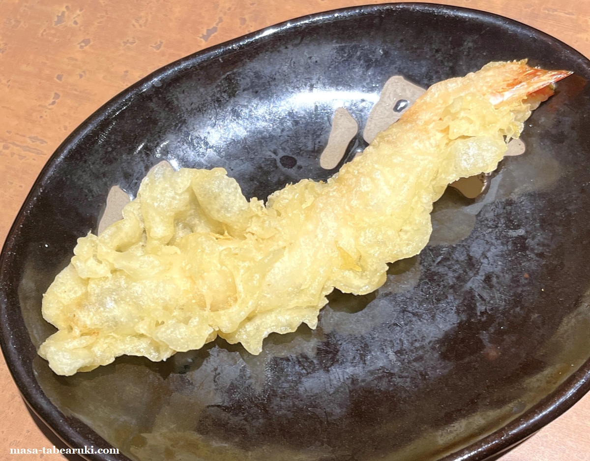 クーポンの海老天です。揚げたてではなさそうなので、出汁に浸して食べたほうが良さそうかと。きつねに海老天がプラスされちょっとだけ豪華に?なりました。