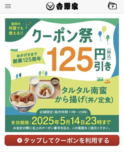 | 【週替わり】 タルタル南蛮から揚げ(丼/定食)125円引きクーポン | 5月8日(木)11時 | 5月14日(水)23時 |