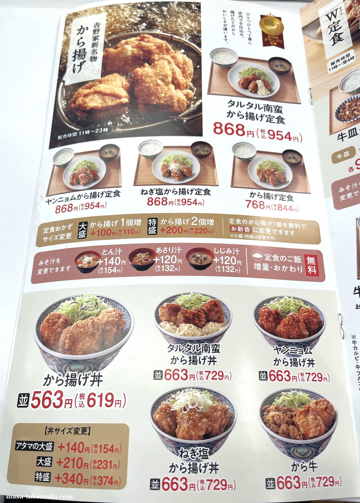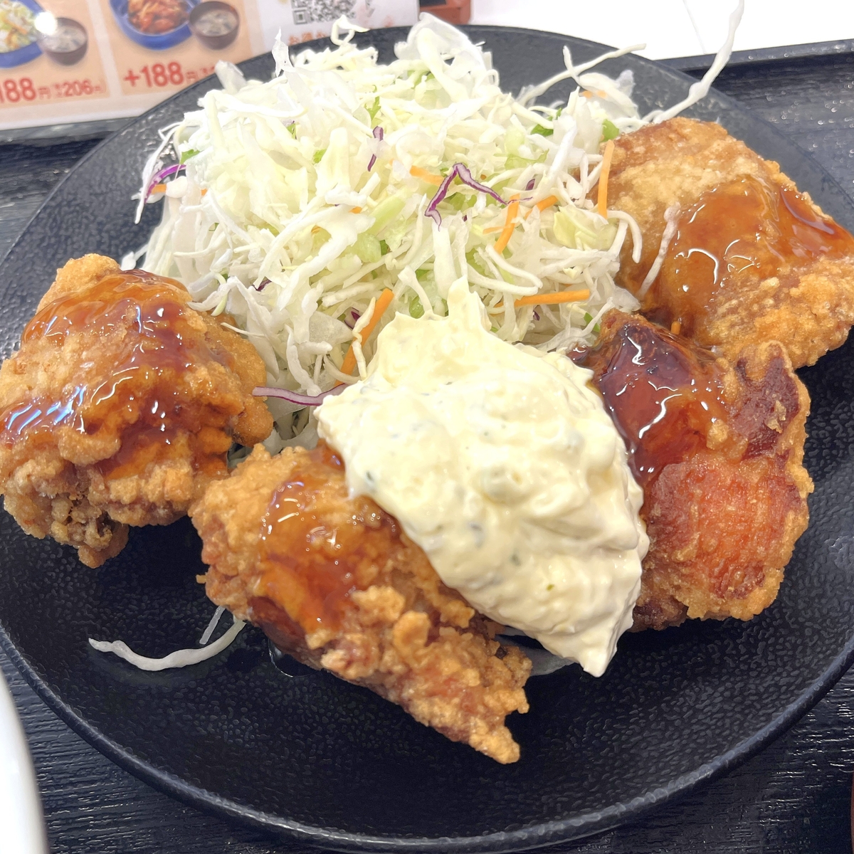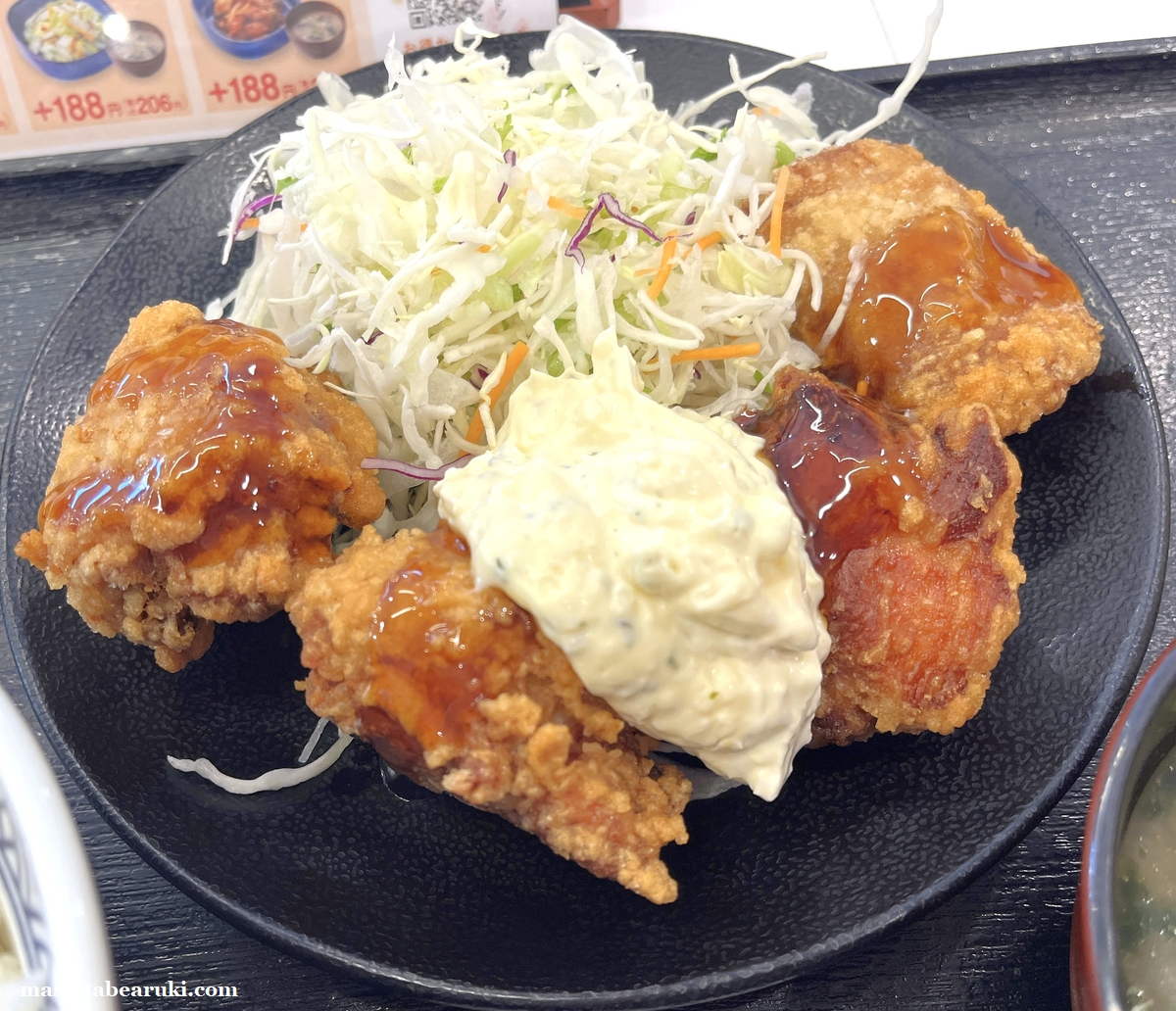 今回は2日連続で吉野家に来て、クーポンの影響もあり前日の牛肉とは違うから揚げメニューから「タルタル南蛮から揚げ定食」を食べてみました。週替わりのクーポン対象メニューとなっており、並盛の通常税込954円が125円引きの829円で食べることができ、前日の牛皿定食よりも腹具合は満足できるくらいのボリューム感がありました。