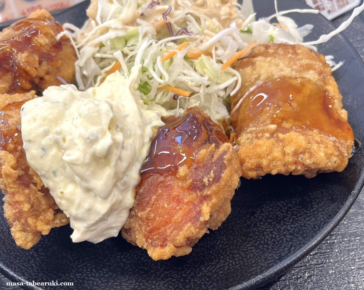 から揚げの外側はパリッとした食感で中はジューシーさがあり、サイズは大きめのためなかなか食べ応えもあります。タルタル南蛮の場合は通常のから揚げに甘辛いタレとタップリのタルタルソースが載せられた状態。から揚げとも良く合う味わいでノーマルのから揚げ定食とはまた違った感じで楽しめますね。
