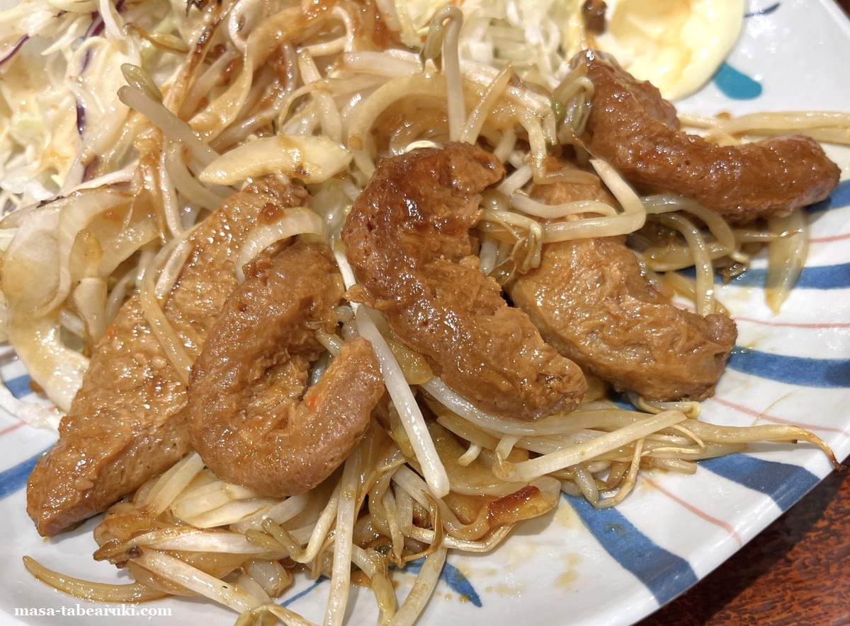 大豆ミートの量はそれほど多くは無く、どちらかというとモヤシ炒めに近いかも。そして大豆ミートのほうですが、何やら変わった食感と風味がして個人的にはあまり肉のイメージはありません(どちらかというとお揚げ?)。味は確かにしょうが焼なのですが、ブヨっとした食感が私には合わないように思えました。