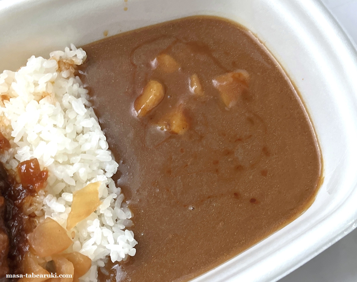 テイクアウトの場合、ルーは別容器に入っているのでまずはご飯の横に注ぎます。そして添付の辛口ソースを全投入しますが、やはりもう1袋欲しいところかな。