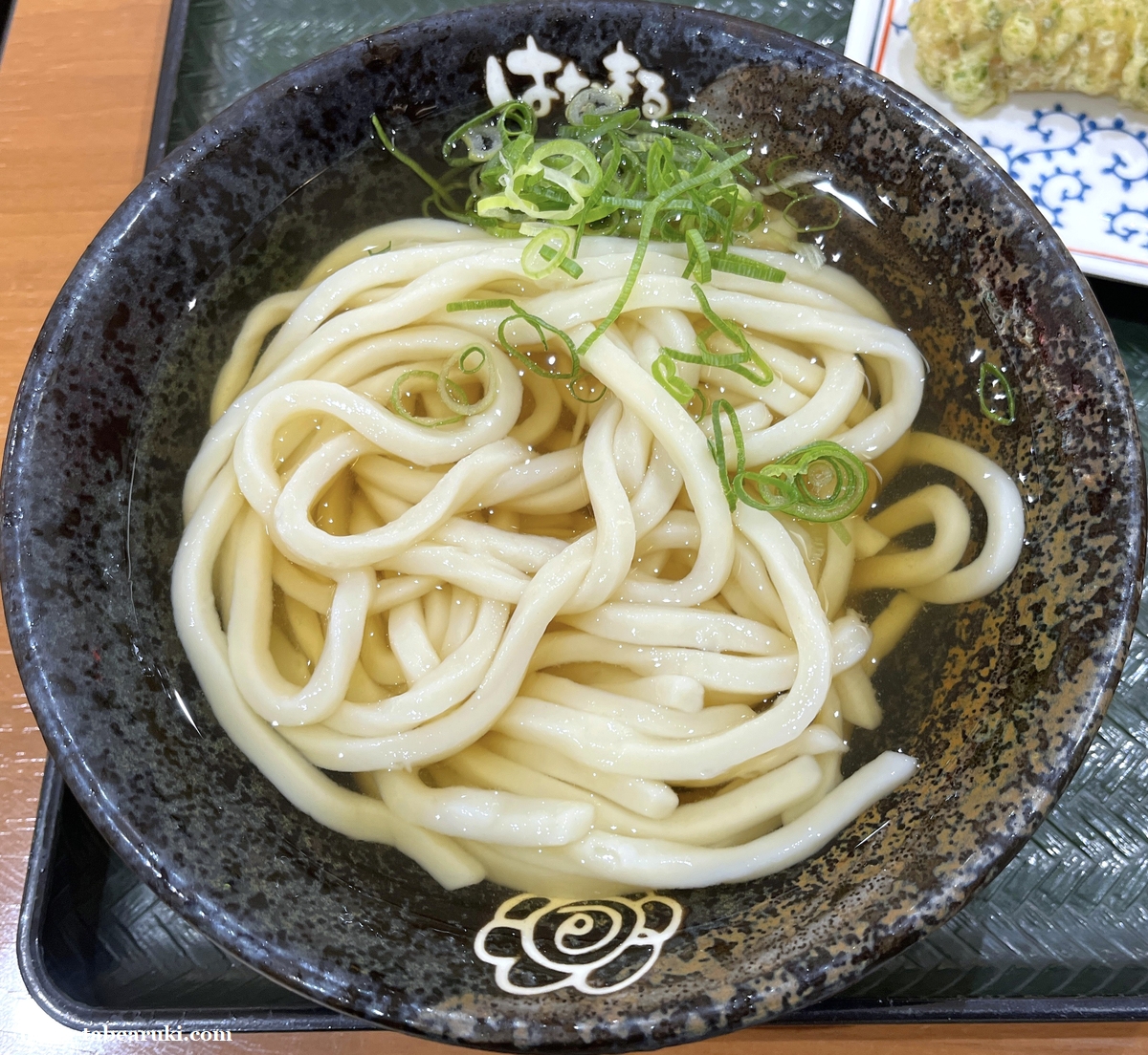 大サイズでも良かったけどサイドの天ぷらも食べたかったので中サイズにしました。調理を見ていると予め茹でてあったうどんを水にくぐらしてさらに水を切った後、冷蔵庫から取り出した出汁を入れ、ネギを載せて完成という非常にシンプルなうどん。