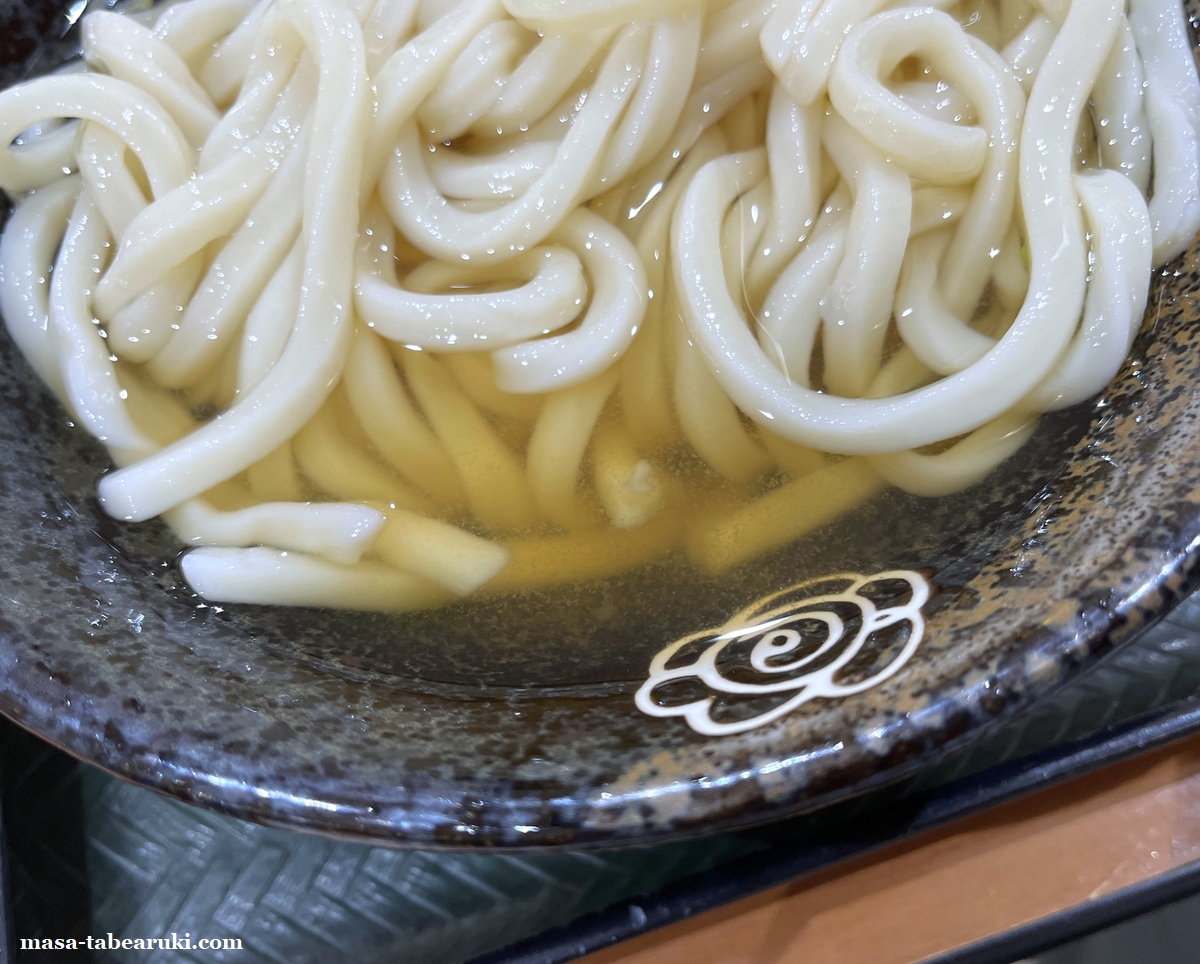 うどんは太くややカタメくらいに思える食感でほんの少し芯も残っている感じでした。中サイズは2玉ということなんで、それほど多くはないものの個人的には出汁の方がメインになっている印象。その出汁はキリっと冷たくしっかりと旨味も感じられるくらいの出汁感。いつもなら揚げ玉を入れるのですが、置かれていなかったので入れずに食べたけど、すっきりと出汁を楽しめるのでこれも良いかも。