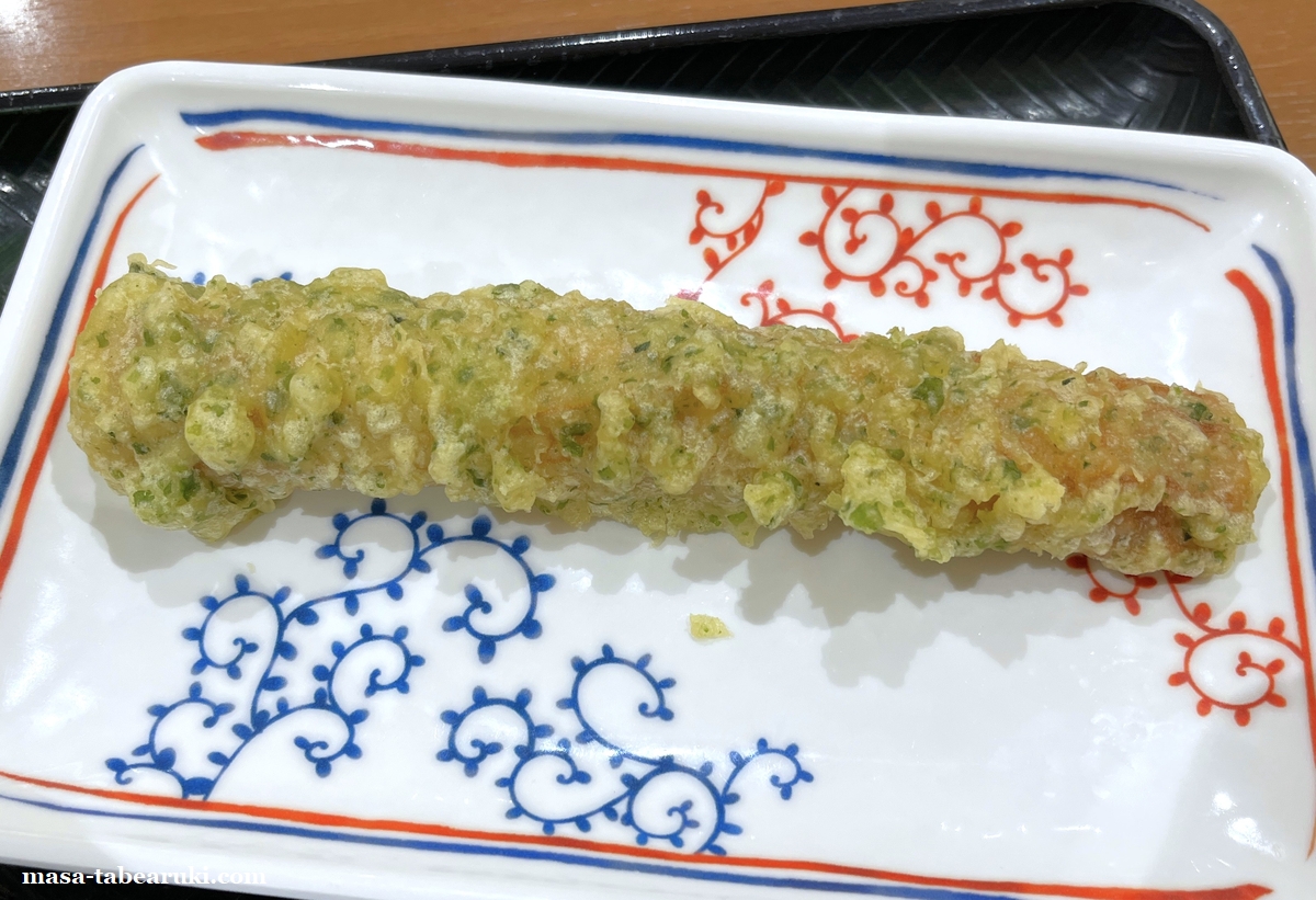 ちくわ磯部揚げです。はなまるの中では一番安い天ぷらで、半身ながらサイズも大きいので個人的にかなり好きな天ぷらです。