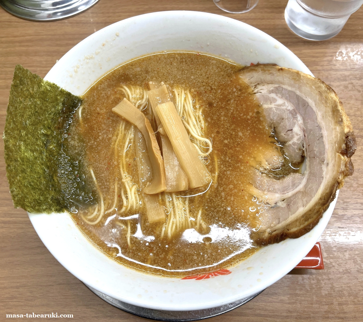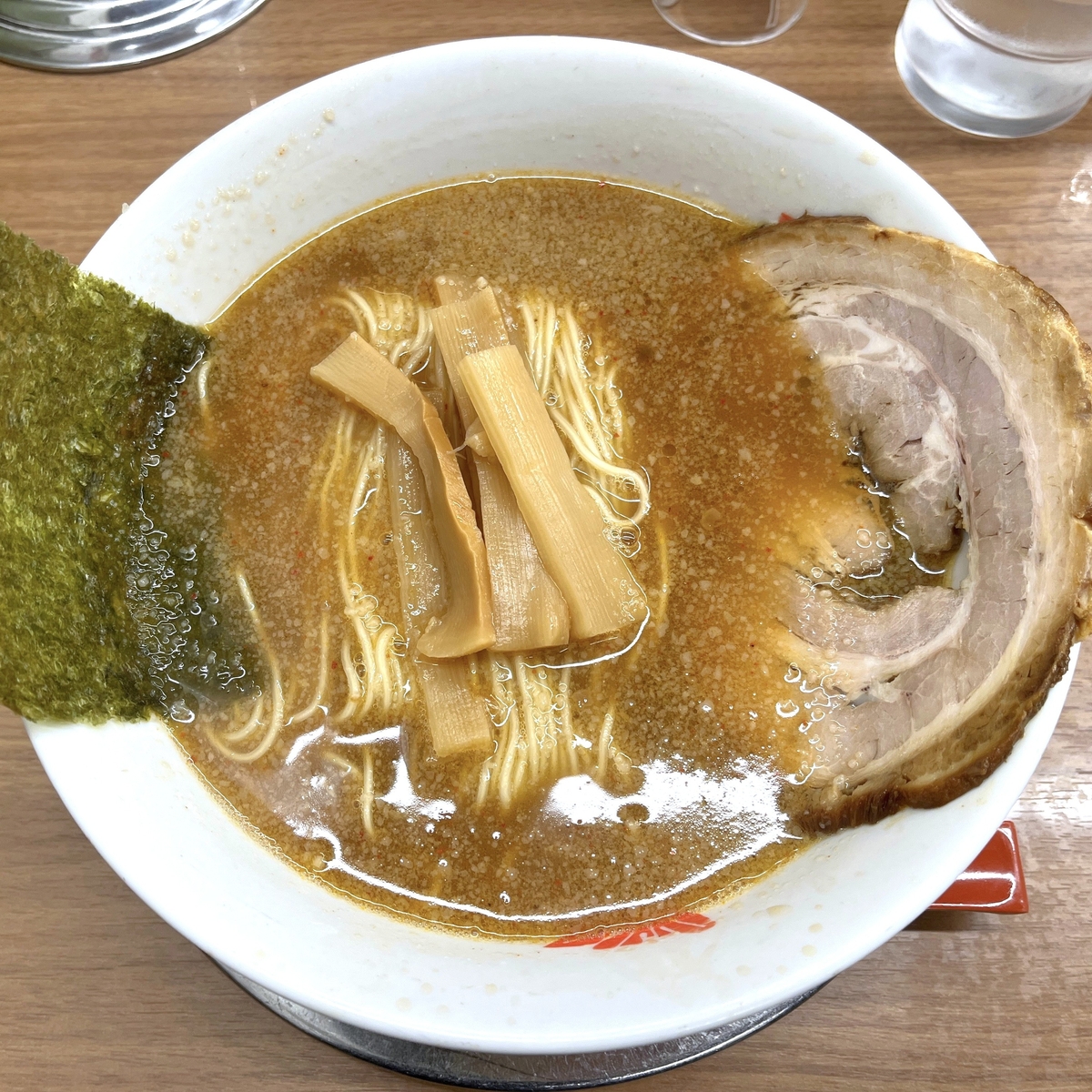 三つ目の特長は豚骨と鶏骨のスープに和風出汁を加えたというスープ。ややトロっとしており濃厚さもありながらしつこさは感じず、時折くる一味のピリッとした辛みがアクセントになっています。麺は細めでスープとも合う歯切れの良さのあるタイプです。