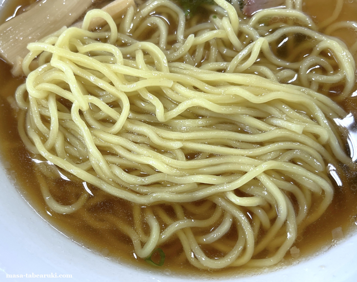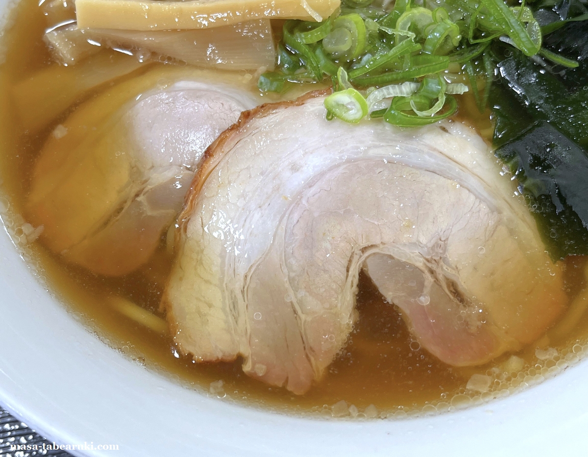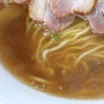 チャーシュー、麺、スープ共に特別珍しい感じでは無く、チャーシューはバラ肉っぽいものが2枚で食べ応えはもうひとつ。麺は縮れが入っており想像よりもカタメの茹で加減。スープはあっさりした醤油で特に変わった風味などはありません。