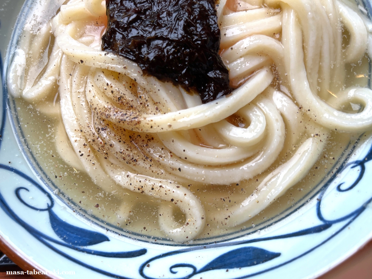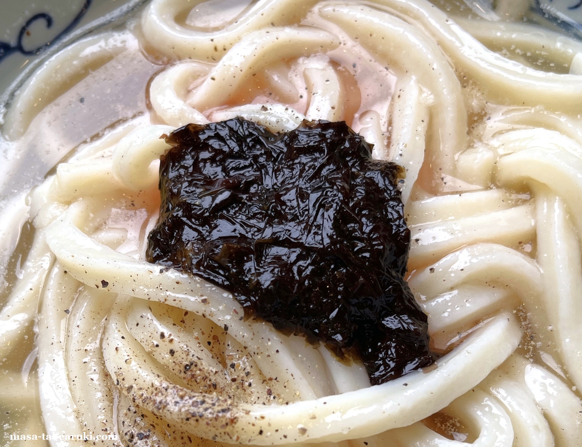なかなかシンプルなうどんですが、載っているのは海苔とブラックペッパーのみ。セルフコーナーでネギを入れるべきだったのを忘れてました。。また、海苔のまわりの出汁が赤くなっていますが、これは公式HPにこのように書かれています。