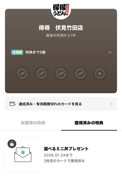 今回はLINEのクーポンを使用してミニ丼をゲット。得得で前述したとおりにLINEだけでなくアプリもあり、様々なクーポンを受け取れます。冒頭にも書きましたが無料で毎回貰えるサービスもあるので、いつも何かしらのクーポンが利用できるのでついつい訪問。そしてスタンプが貯まってまたクーポンをゲットというサイクルに私はハマっているようです(笑)