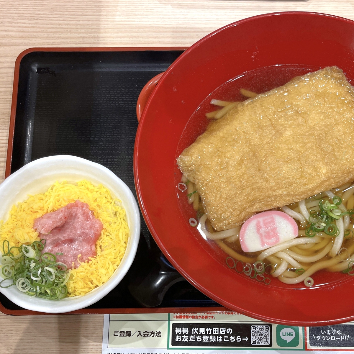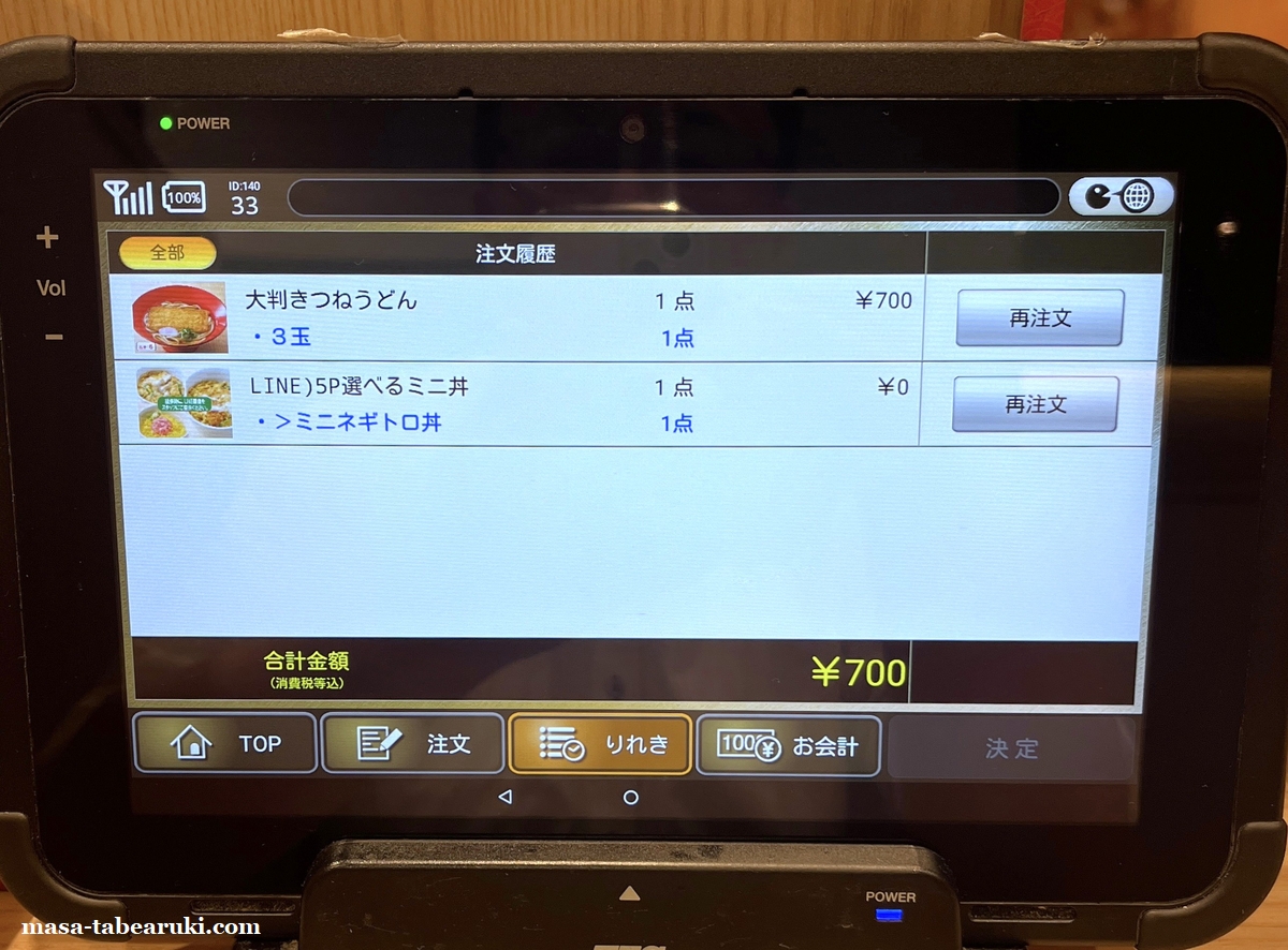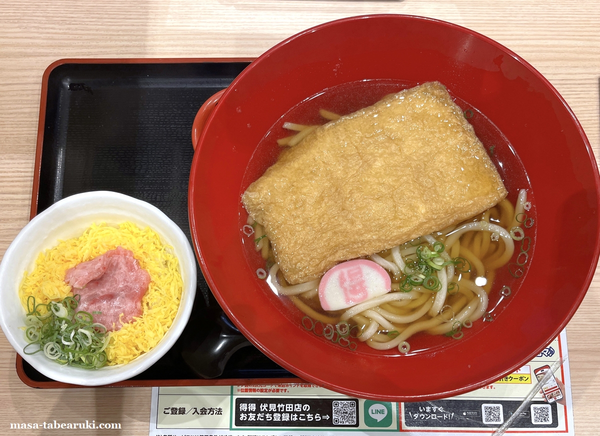 税込み700円以上のものを注文しないと使用できないので今回はちょうど700円となる「きつねうどん」を3玉でお願い。選べるミニ丼はミニネギトロ丼を選択し、待つこと数分で到着しました。