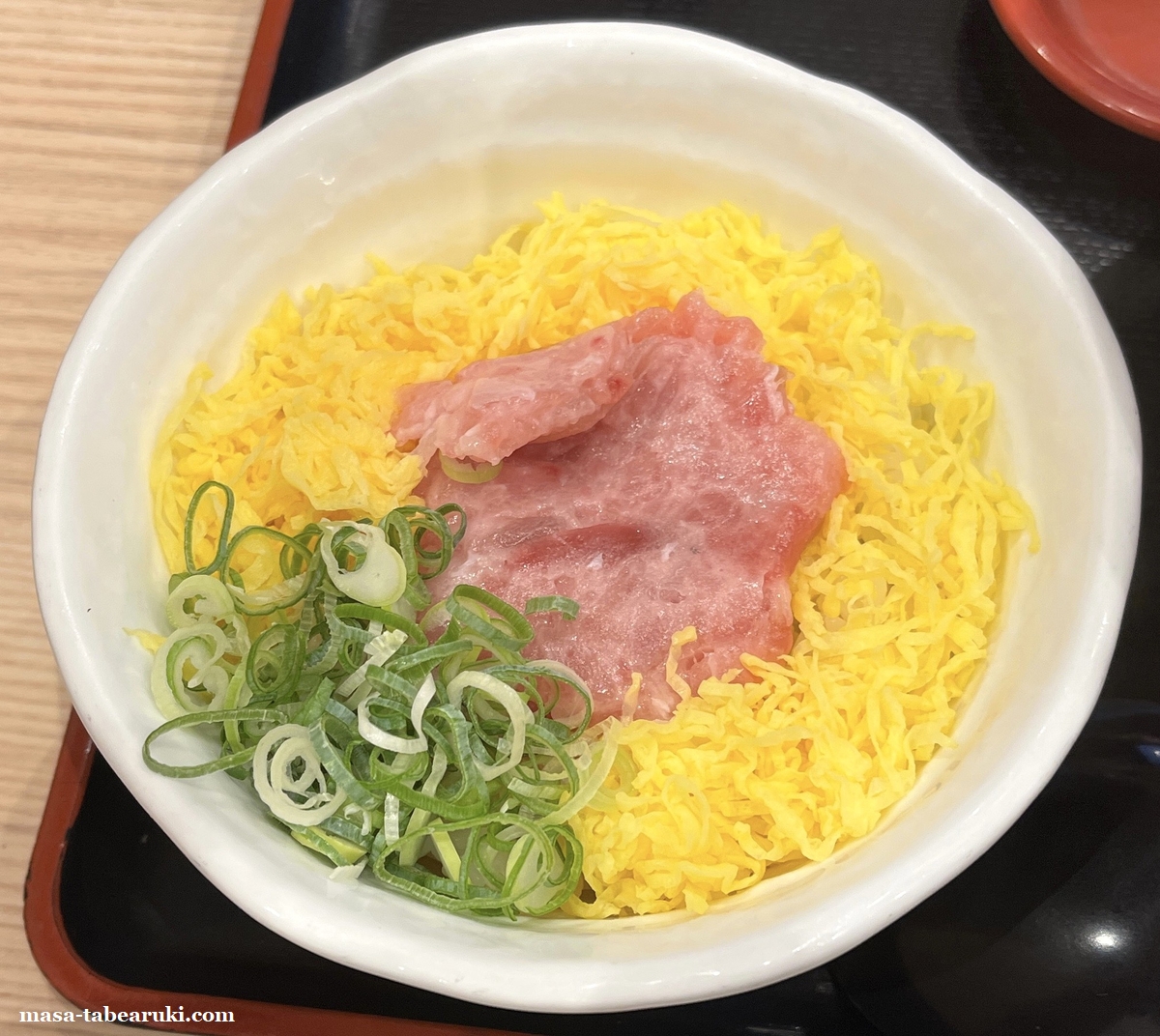 ミニのため量的には多くありませんが、ネギ、マグロ、錦糸卵がのっており、醤油をまわしかけて頂きます。ちなみにわさびは分からんかったので諦めました。