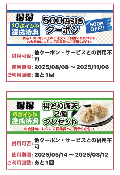 毎回何かしらクーポンが使える。得得はアプリとLINEでダブルでお得。