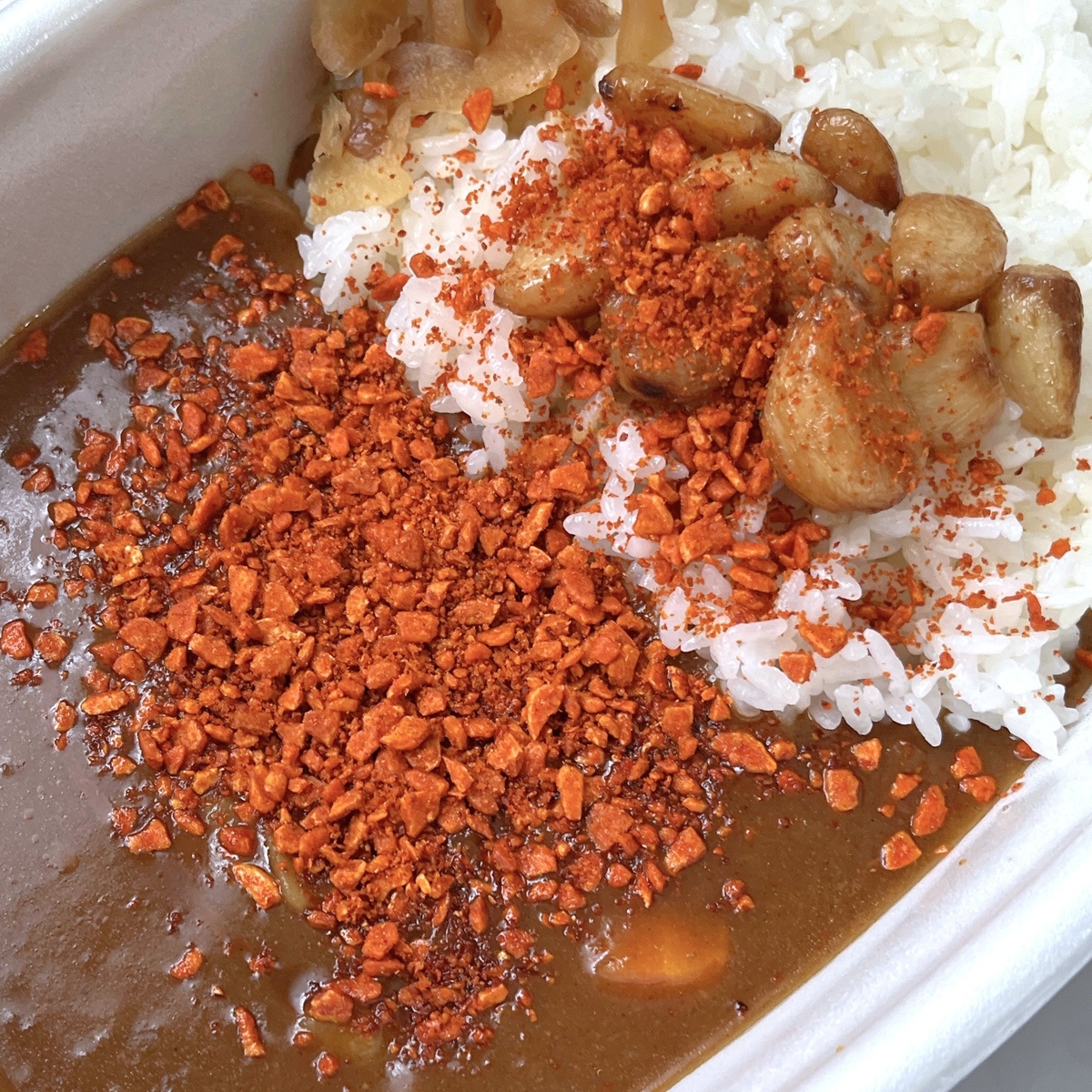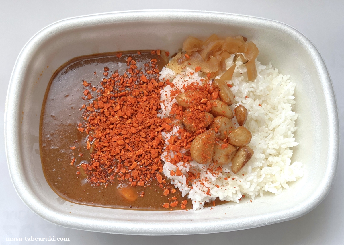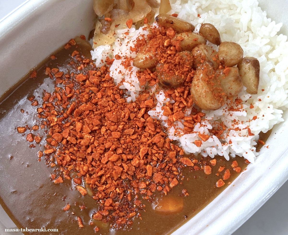 そして辛さに影響してくるのがこちらの「にんにくファイヤー」。ニンニクチップを細かくして唐辛子をまぶしたもので、現在は期間限定商品として提供されています。こちらも価格は税込み70円。ではこれらをカレーにトッピングして頂きます。