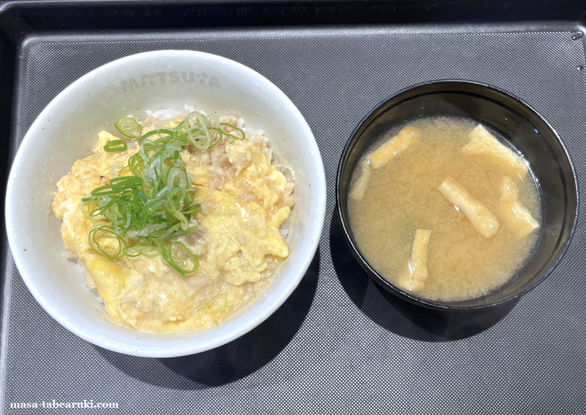 久しぶりに今年から朝食メニューに載っている「とろっとたまご丼」でも食べようかな?と考えていたのですが、ここ松屋南草津店のモバイルオーダーでは表示がない。。試しに大津店のメニューを見ると載っていたのでメニューから無くなった訳では無さそうです。何かお店の都合があったのかな?と思いながら、今回は同じたまご丼として最近追加された「鶏そぼろたまご丼」を注文することにしました。