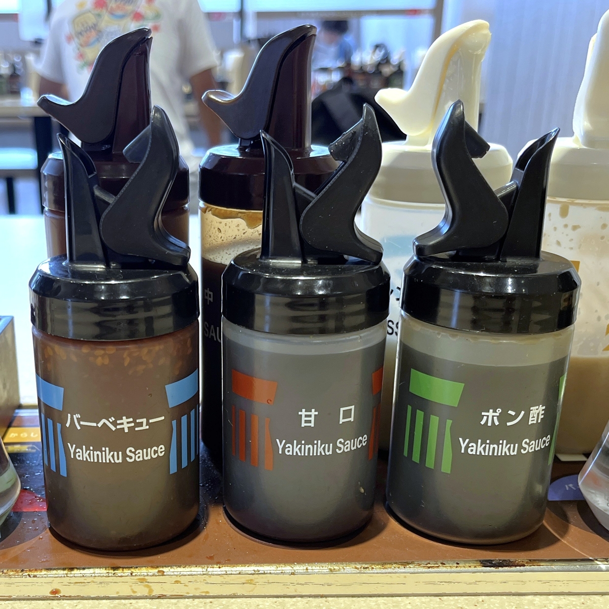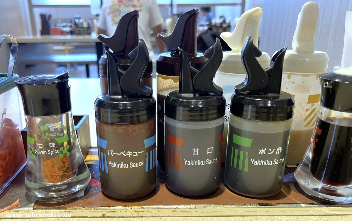 追加料金なしで変化をつけようと思うと卓上にある調味料を使用する形になりますが、さすがにドレッシング類は除外(新しい味わいを発見できるかもしれんが想像だけでもちょっと苦しい)。他の調味料となるとソース類でバーベキュー、甘口、ポン酢、醤油、七味、(併設店なのでからしもあり)となります。