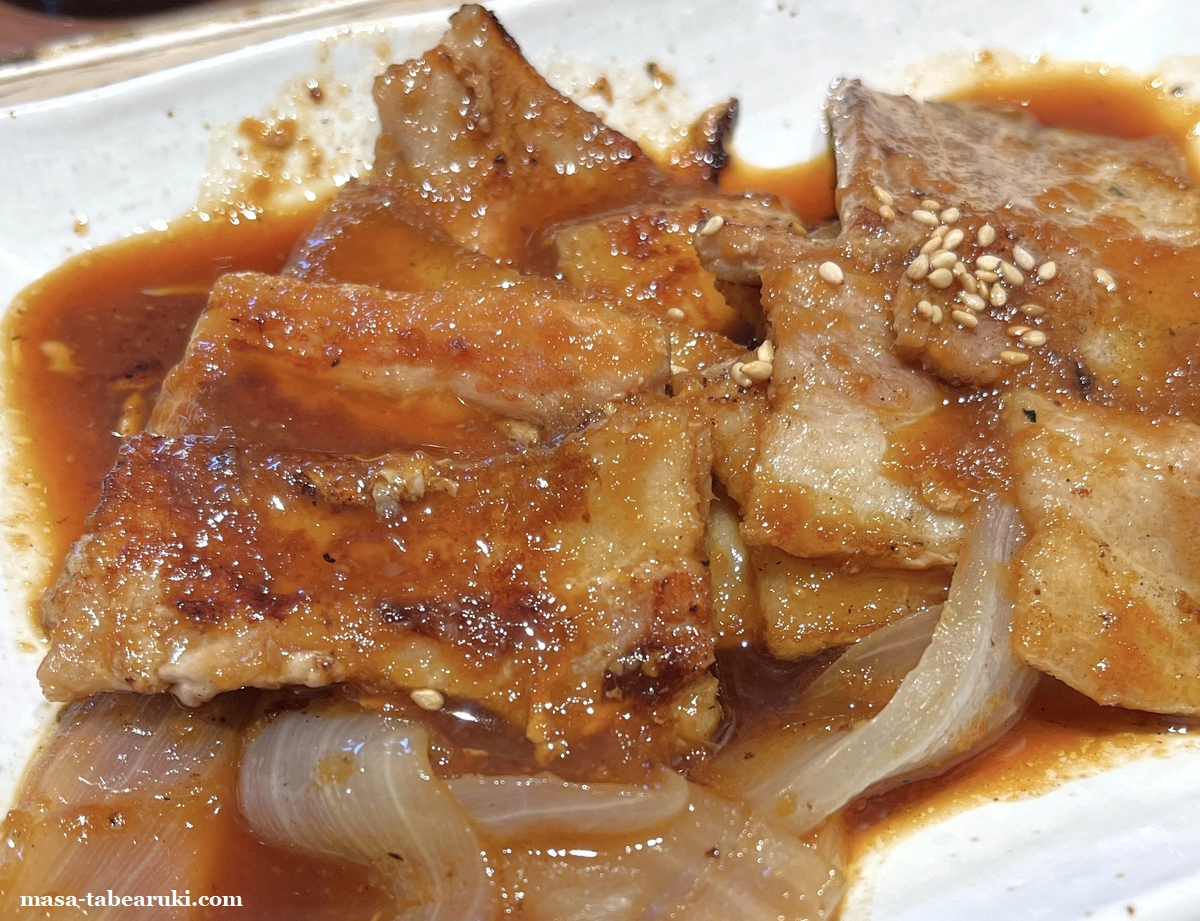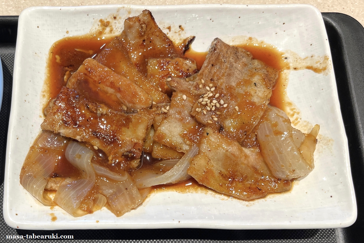 今回は個人的に一番リピートしているメニュー「スタミナ厚切り豚カルビ定食」でヤミツキになっている食べ方をしてみました。元々は吉野家で牛皿定食を食べる時に行っている食べ方なのですが、この定食でも旨いのでは?と思ったためやってみるとかなりハマってしまう結果に。