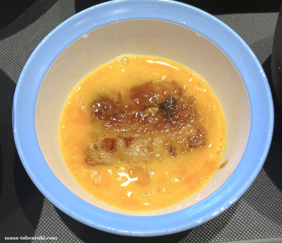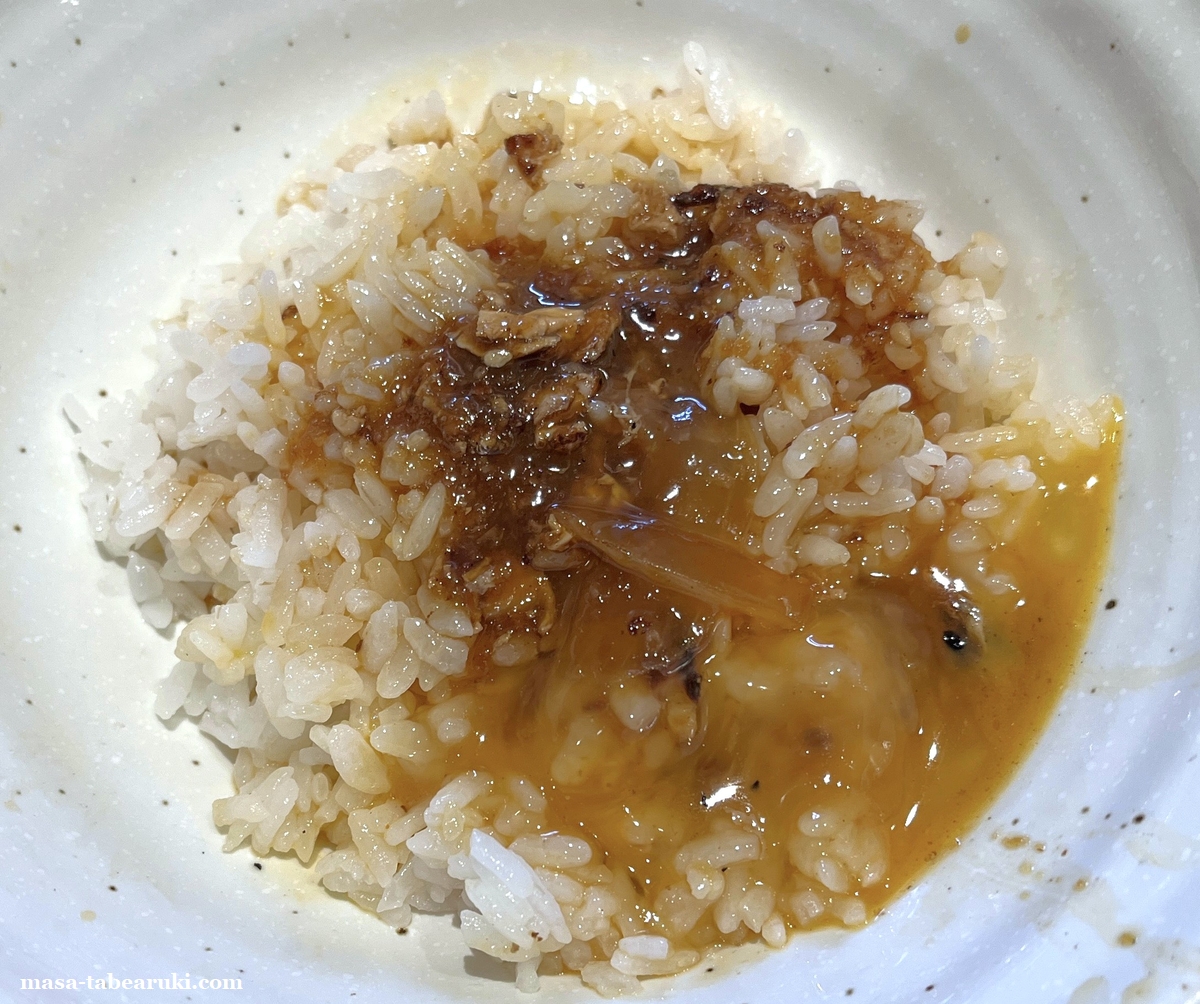濃い味わいは非常にご飯もススムとは言え、オッサンの私ではずっと食べ続けるのはキツイ部分もあるので、玉子でマイルドになると非常に食べやすくなります。味の濃さは玉子に浸すか浸さないかで変えられるし、最後はタレと残った玉子で玉子かけご飯として食べれば満足感も。