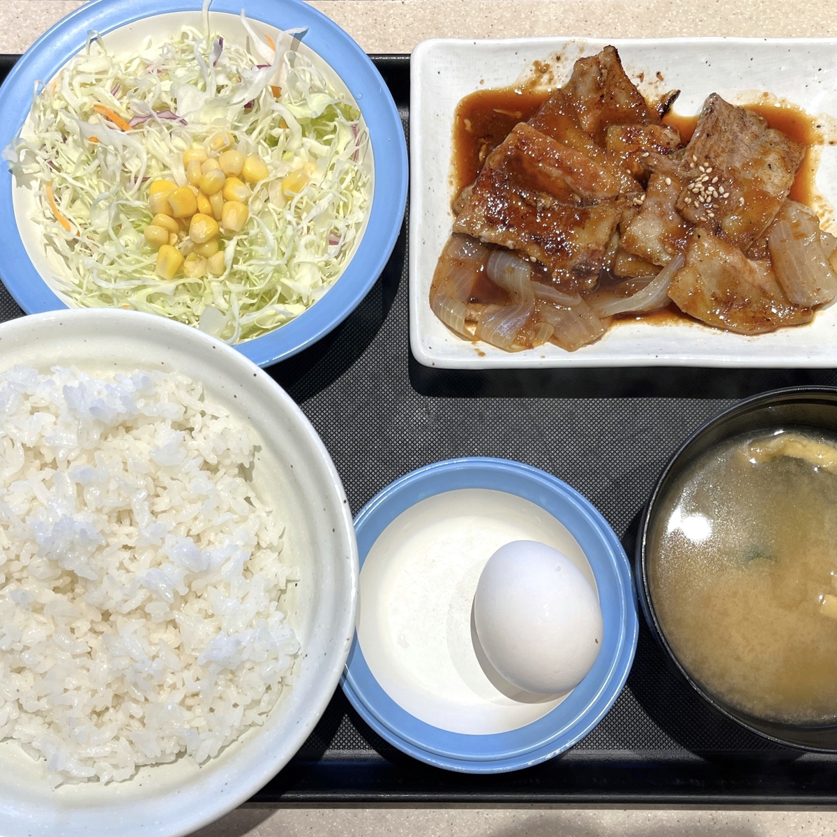 追加で注文したのは「生たまご」で、これが無いとヤミツキになっている食べ方が出来ないくらい重要なアイテム。定食にはメインの皿の他にご飯、みそ汁、サラダという構成。ご飯に関してはブランチとはいえ、ちょっと抑えるために大盛でお願いしおかわりも封印しております。