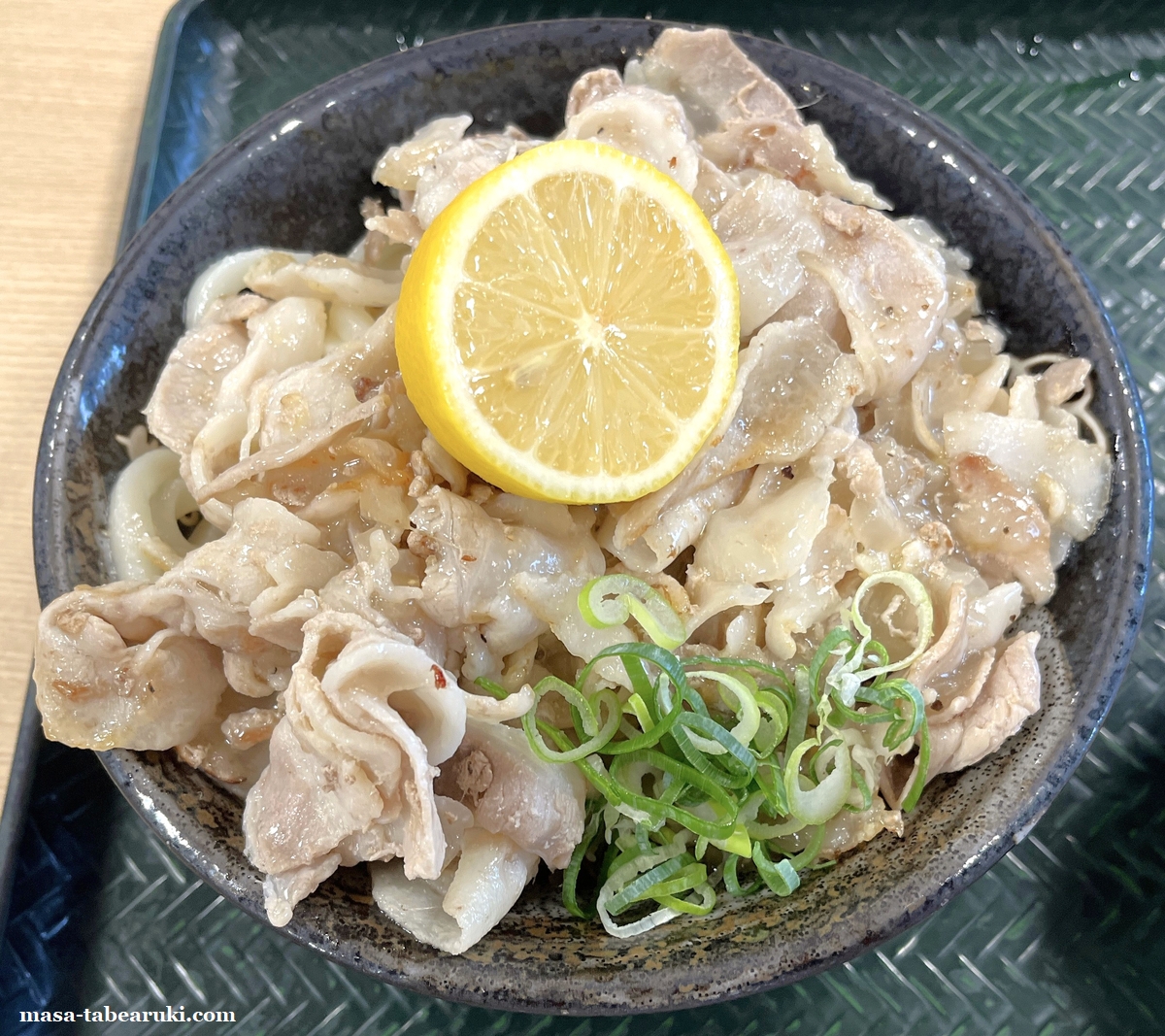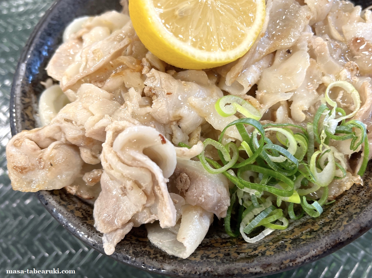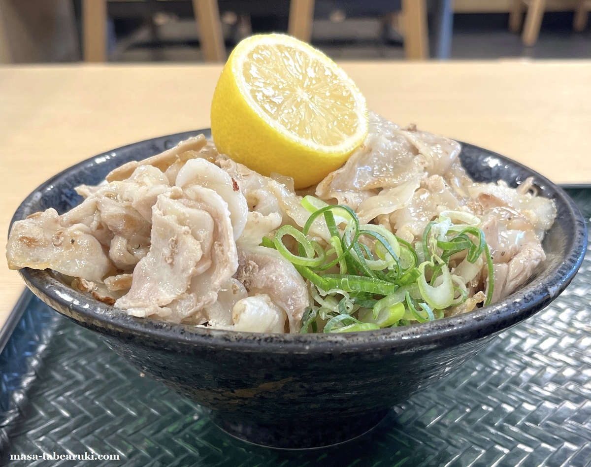 はなまるうどんで”肉々しい”のをやってる。『焼き塩豚カルビの半割レモンぶっかけ』