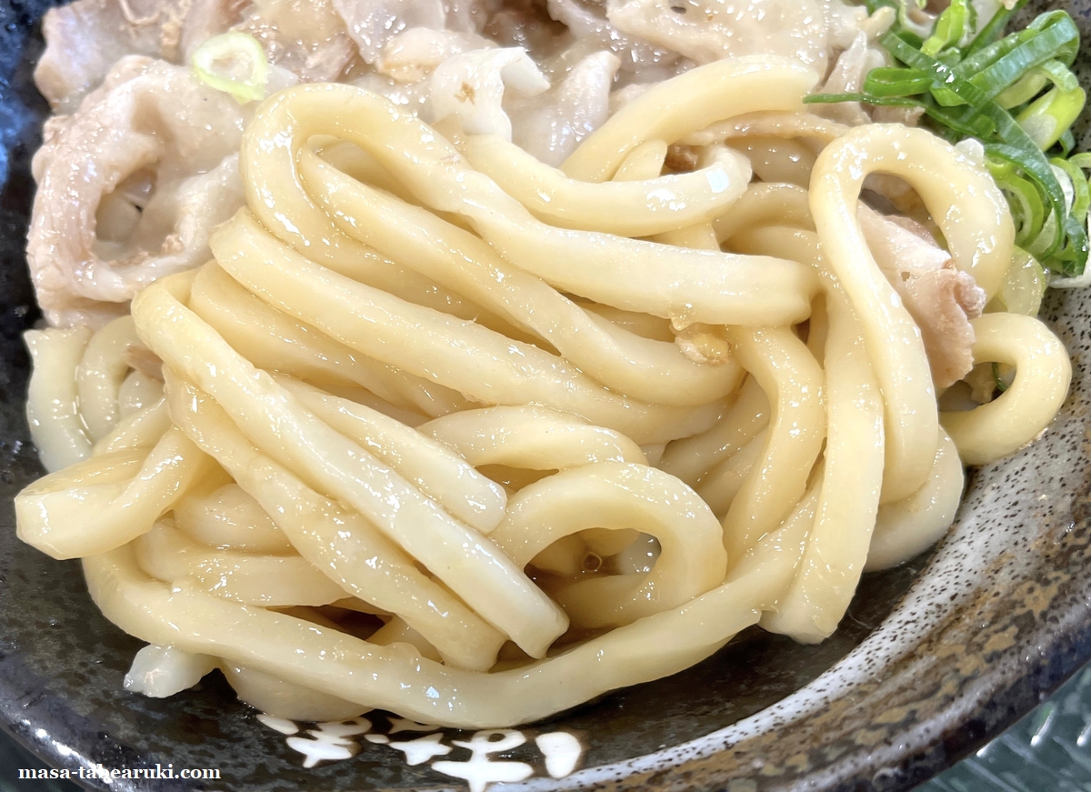 うどんはいつもの太く強めの食感ながら、温にしたためちょっと柔らかい印象。個人的にはやっぱり「冷」にした方が良かったかなとも思いました。