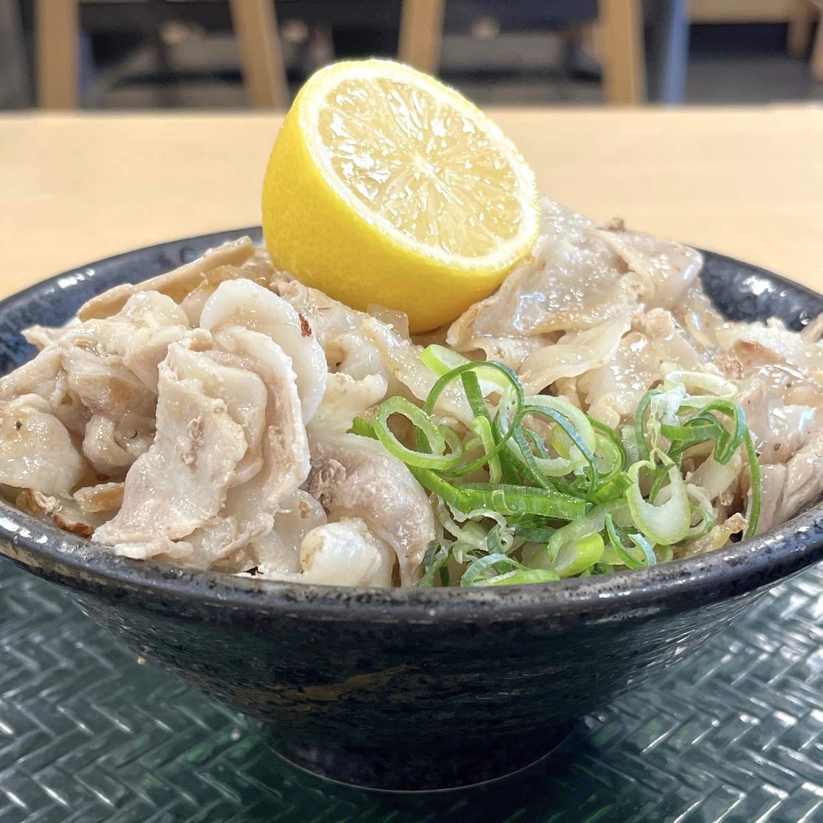 香川県にあるお店のうち5店舗を刷新してそれぞれに異なるコンセプトを付与したお店を順次オープンされているはなまるうどん。その第2弾となる肉店で提供されるメニューのうちのひとつが「焼き塩豚カルビの半割レモンぶっかけ」。