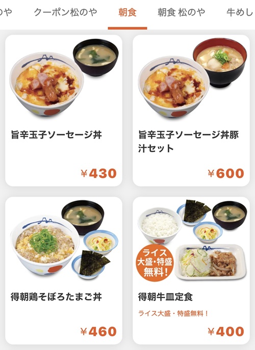 この日は割と気温が低めだったので(と言っても30℃くらい)まだ歩きやすかったためいつもより少しだけ多めに歩いて来ました。終了後、いつものように松屋に朝食を取りに向かいますが、モバイルオーダーでメニューを見ていると朝食部分に新たなメニューが追加されているのに気付きました。