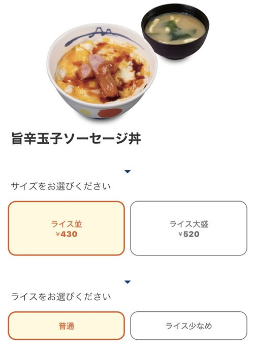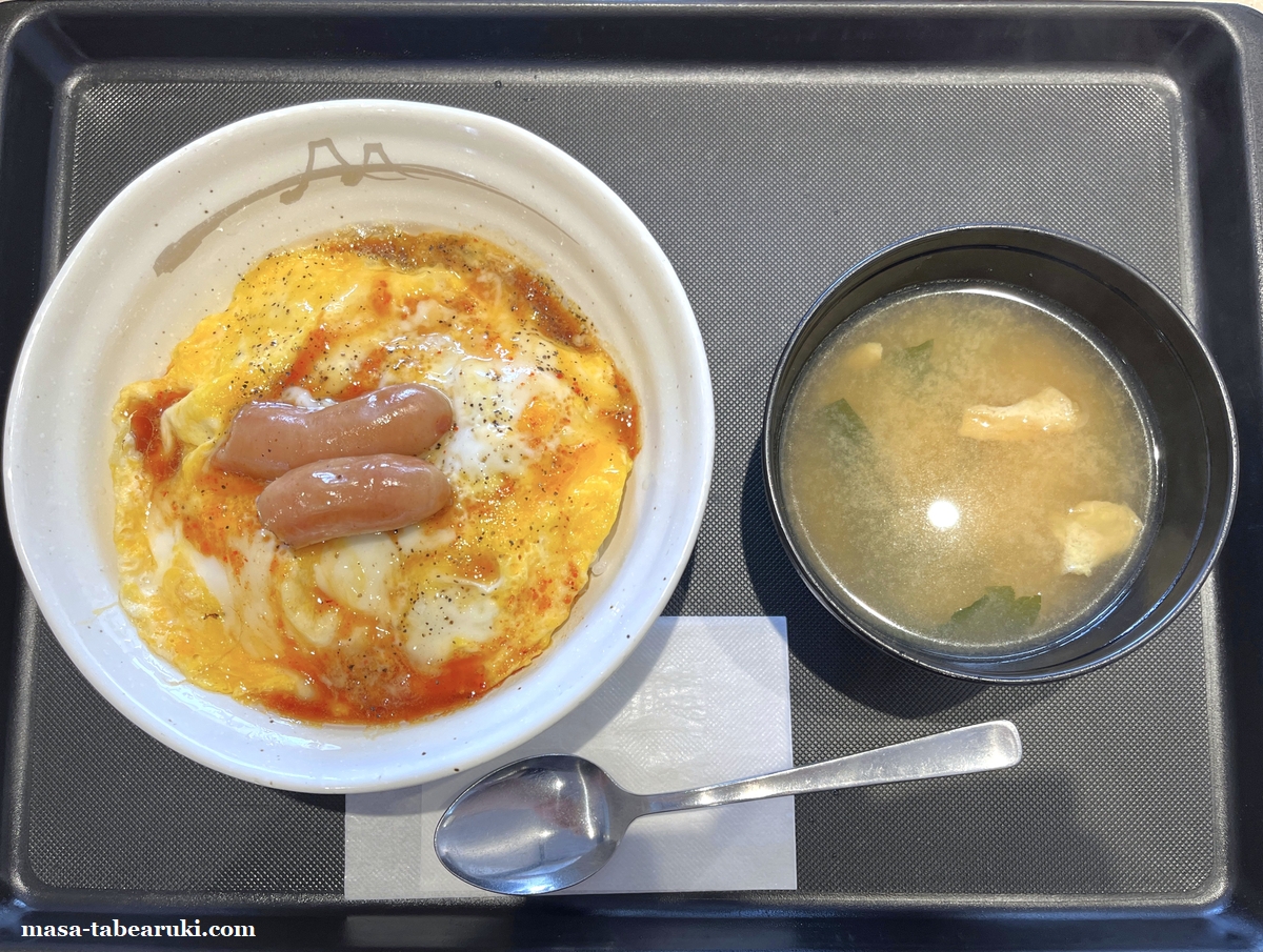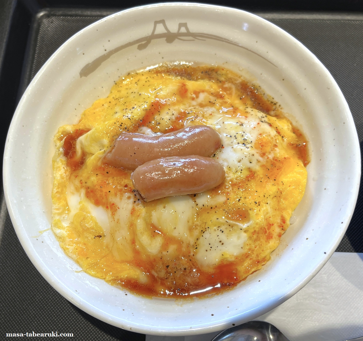 公式HPのニュースには記載は無く、朝食メニュー部分にいつの間にか記載。先日食べた「鶏そぼろたまご丼」も同様にいつの間にか提供されていましたが、新たに追加になっていたのは「旨辛玉子ソーセージ丼」。