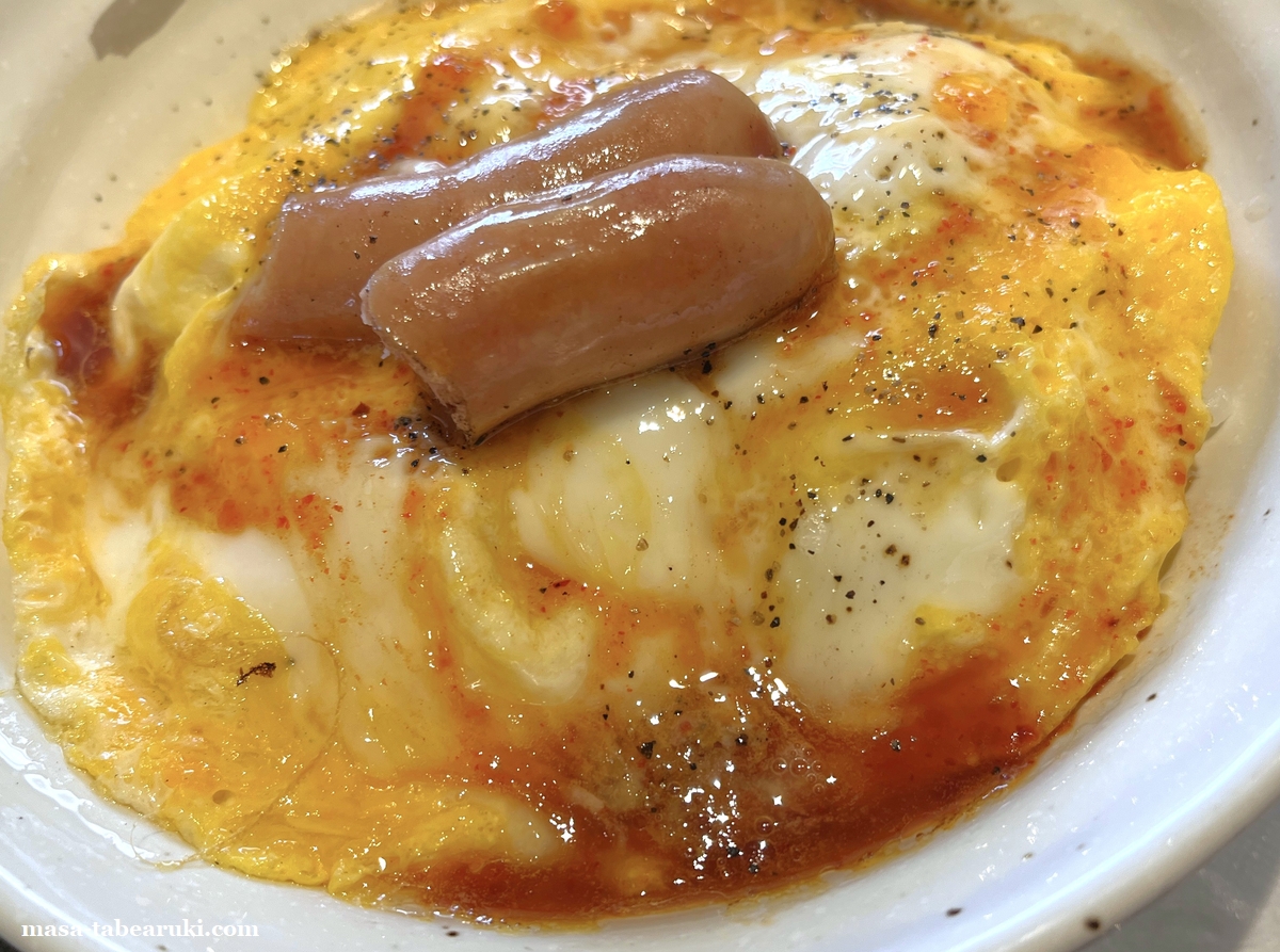 載っているのは玉子と半分にカットされたソーセージ。それに旨辛と思われるソースとブラックペッパーもかけられています。