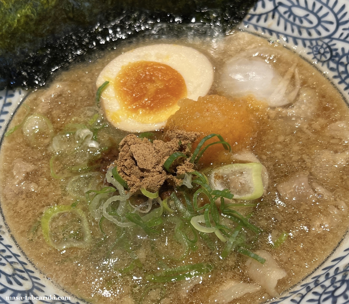 つけ汁はパッと見た感じでは肉そばをそのまま小さくしたようにも見えなくもない。入っている具材は豚肉、タマネギ、もみじおろし、海苔、味玉半個そして魚粉。魚粉以外ほぼ肉そばと同じでつけ麺のためスープは濃い味わいになっているものの風味等は肉そばのスープと同じ印象です。