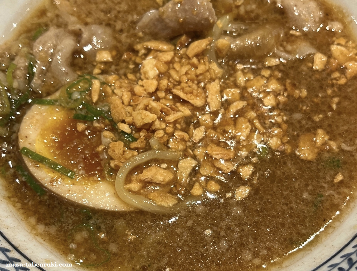 途中で味変として卓上にある揚げにんにくを投入。食感とニンニクの風味がプラスされますが、匂いが気になる方は少量もしくは入れない方が良いかと思います。