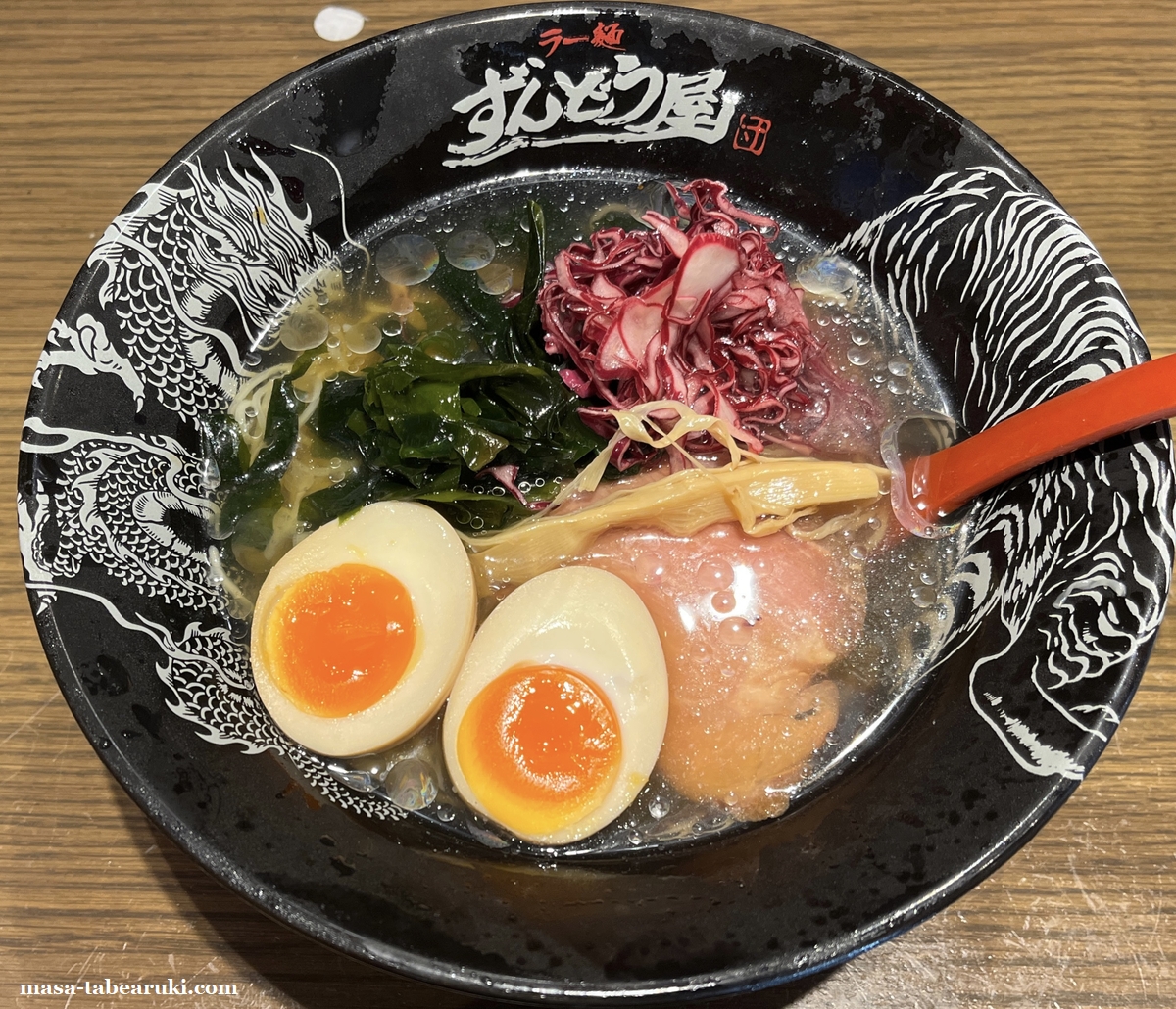 元味とは味玉が入っていないメニューのようで価格的には120円ほど安くなっています。基本の他にピリ辛やマー油があるのはずんどう屋らしい感じもしますが、初めて食べるため今回は基本にすることにして味玉付きでも千円以内となるので「ずんどう屋流冷やしらーめん 味玉」を注文。待つこと6分くらいで到着しました。