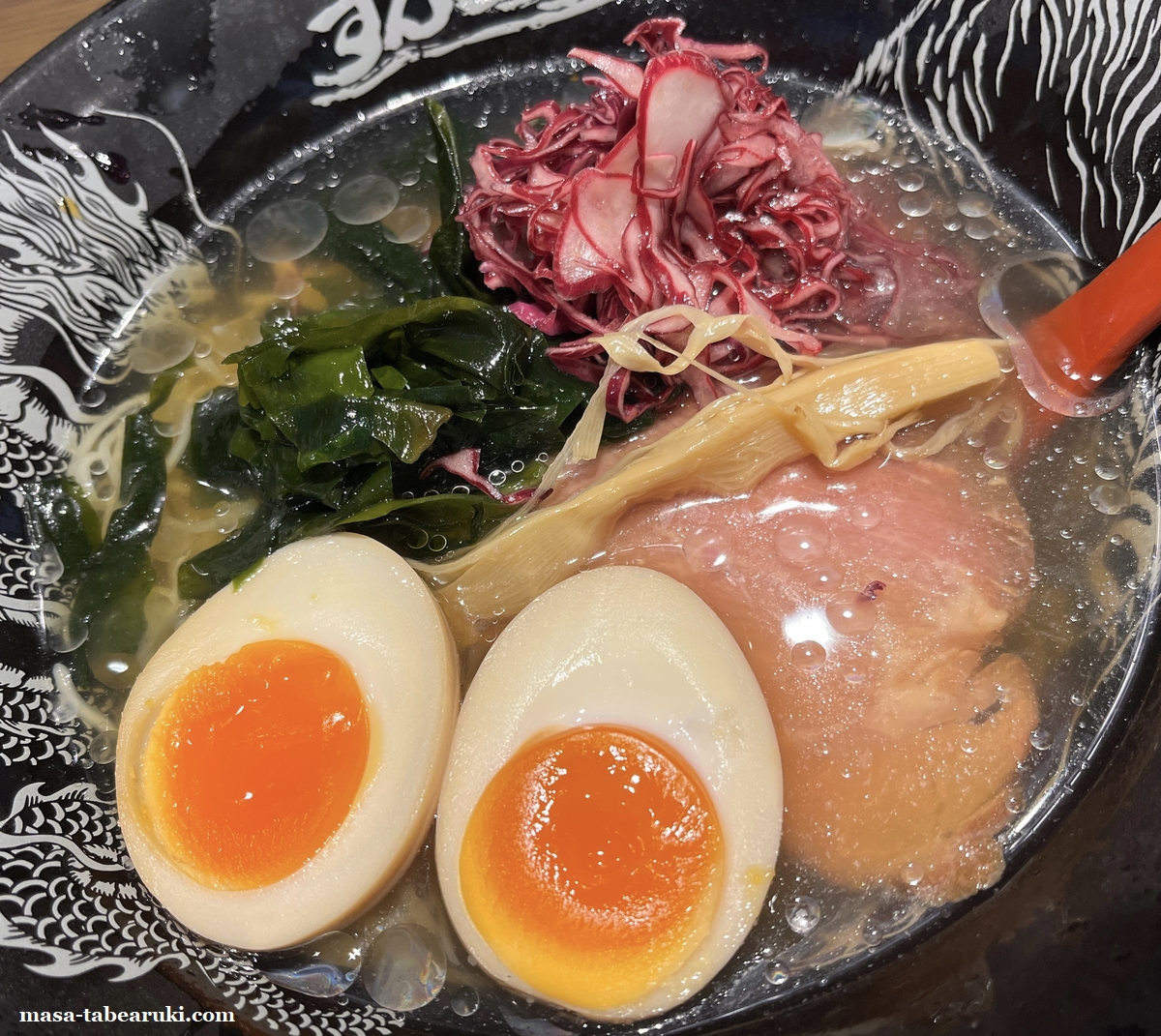 スープはこちらの特長である白濁した豚骨では無く透明感のあるタイプ。具材は味玉、低温調理されたチャーシュー、穂先メンマ、わかめ、赤キャベツ。赤キャベツはプレスリリースによるとマイルドな酢漬けとなっているそうですが、個人的には無いほうがよりスッキリと食べられる気がしたけどあくまで私の好み。