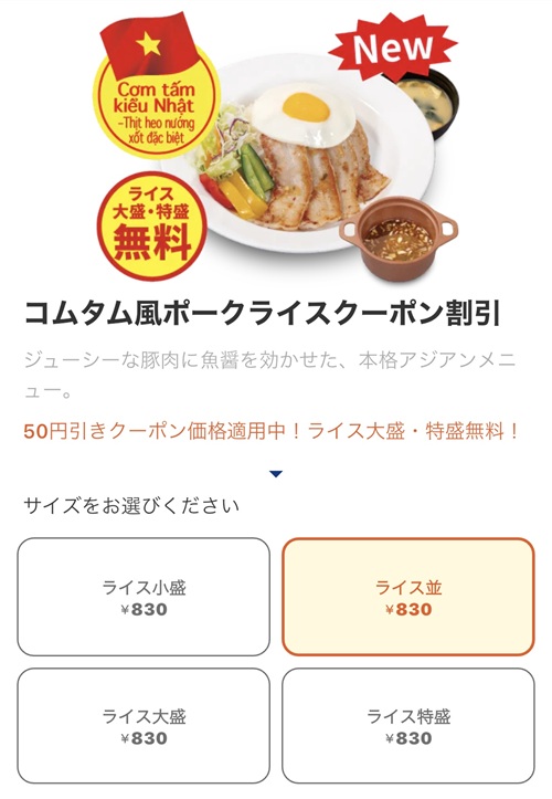 この時はまだ発売から1週間も経っていないため、50円引きクーポンの適用があり830円(通常は880円)となっていました。またライスに関しては並、大、特盛ともに同一価格で変更が可能。早速注文しますが、まだどんな味なのか分からないため、今回はライスは並盛でお願いすることにしました。