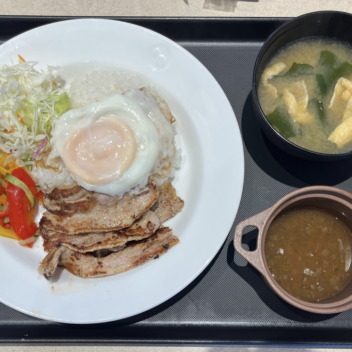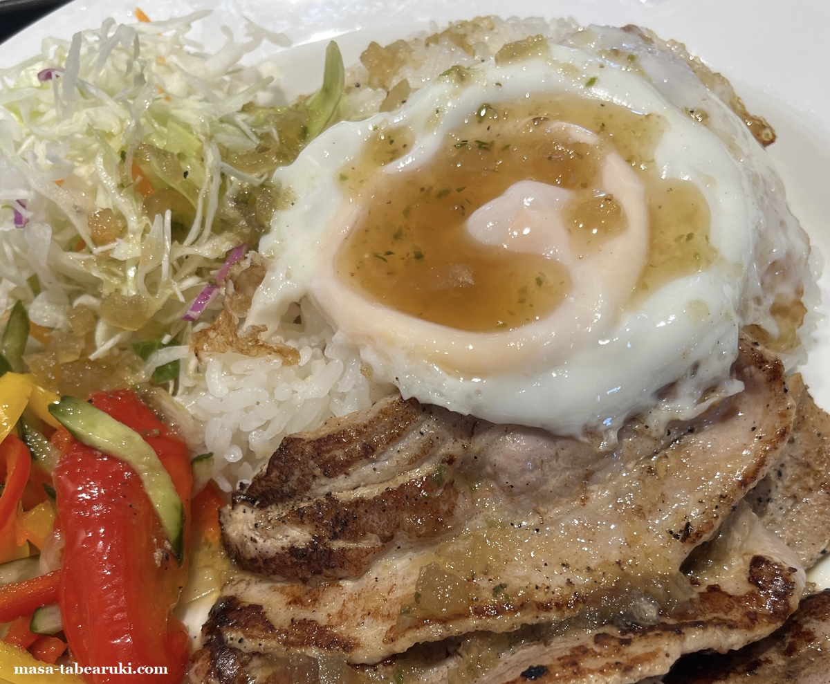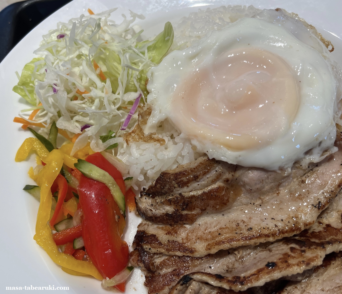 豚肉は焦げ目も付いて旨そうな焼き具合で、味付けはほとんど感じないくらいですが胡椒っぽいものがかかっているようにも見えます。他には目玉焼きとキャベツなどの野菜、そしてパプリカのピクルスのようなものも付属しています。ここまでは特に珍しいものがある感じではありません。