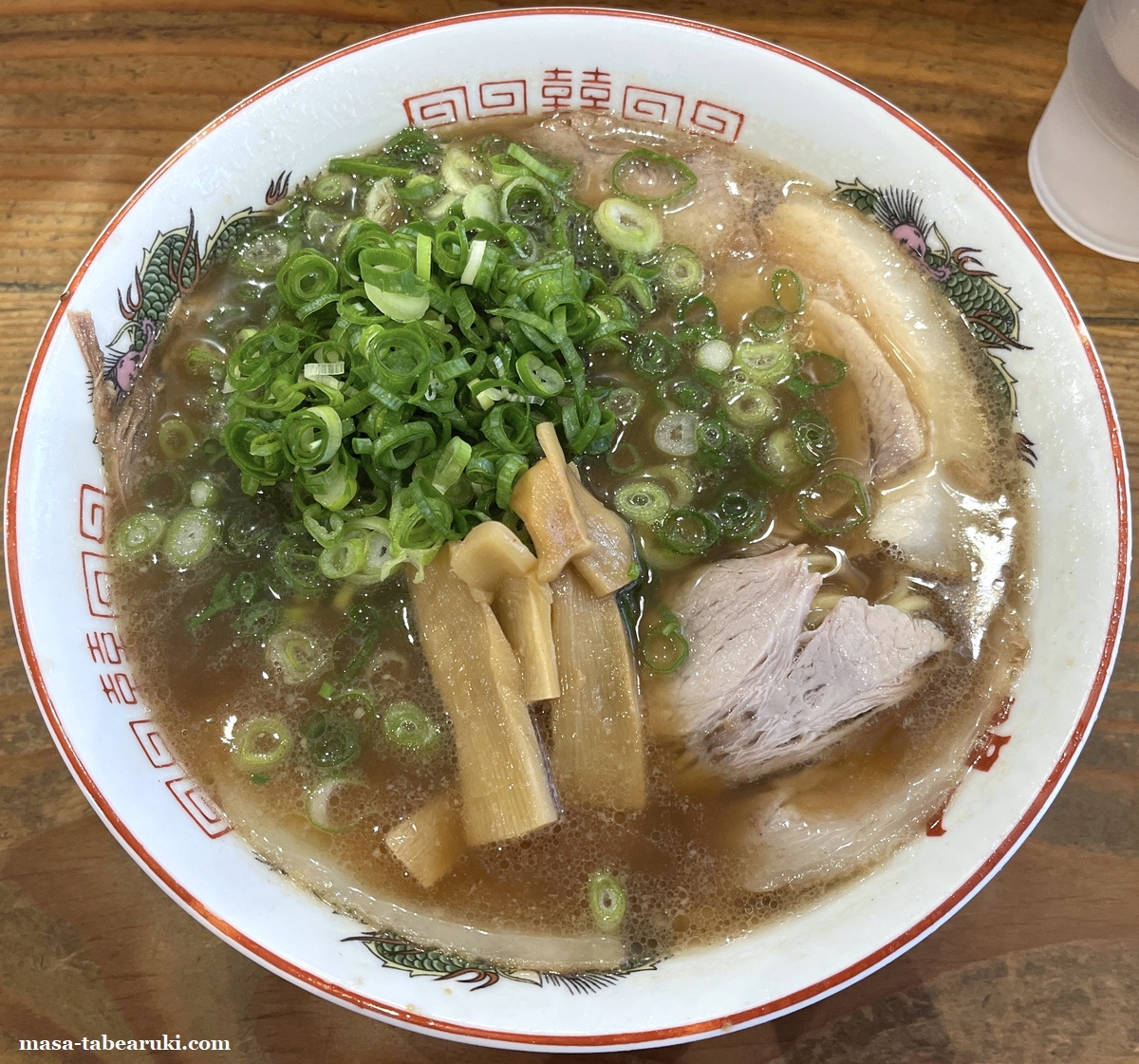 ちなみに大盛は+100円で合計950円と千円以内に収まっております。具材はチャーシュー、ネギ、メンマと定番で見た目は京都定番の豚出汁醤油といった感じ。